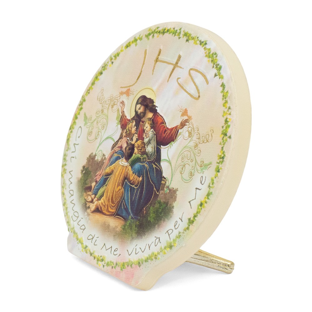 Mini quadretto tondo Prima Comunione con decoro in rilievo raffigurante Gesù con i pargoli.