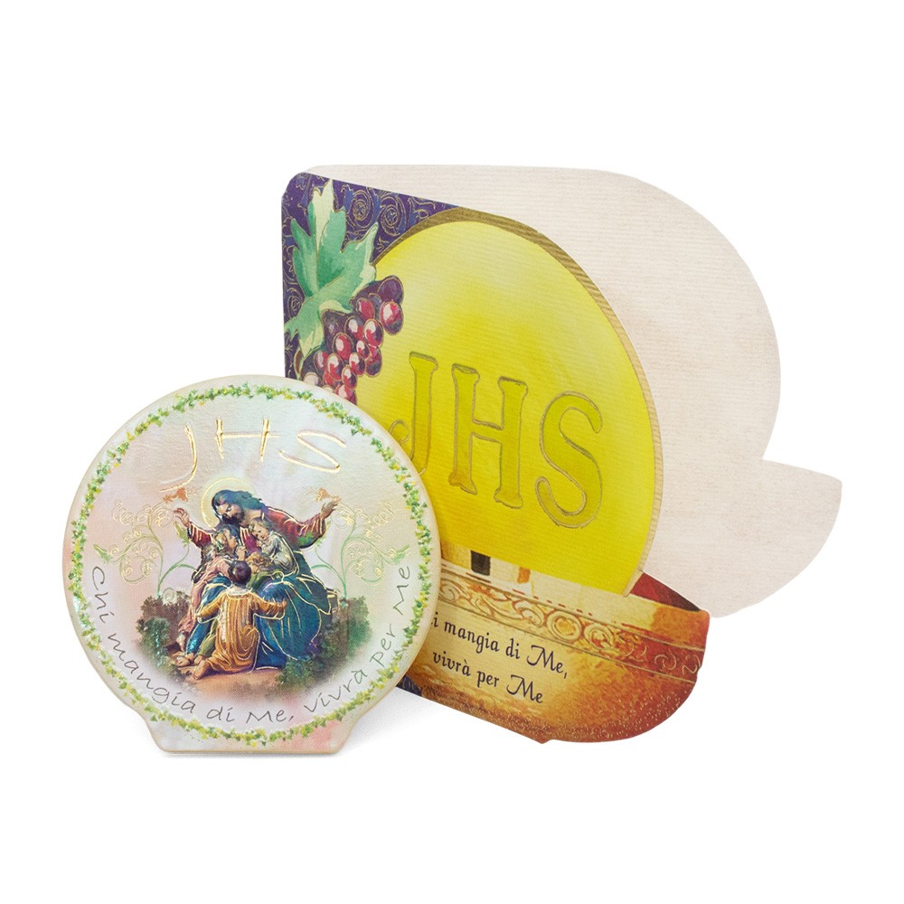 Il tutto racchiuso in un cartoncino decorato con all'interno la possibilità di scriverci il nome del bambino, la ciesa e il giorno del santo Sacramento.