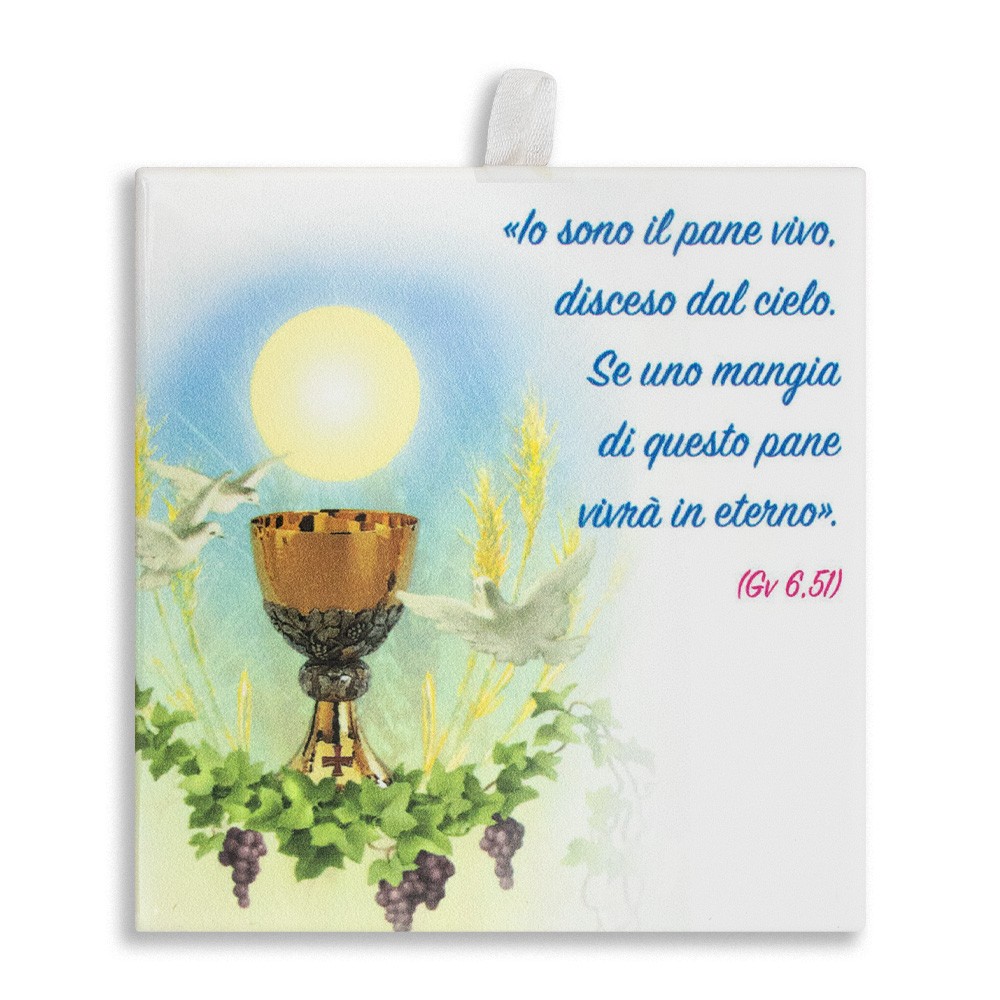 Piastrella Prima Comunione realizzata in ceramica, completa di nastrino bianco sul retro per poterla appendere alla parete.