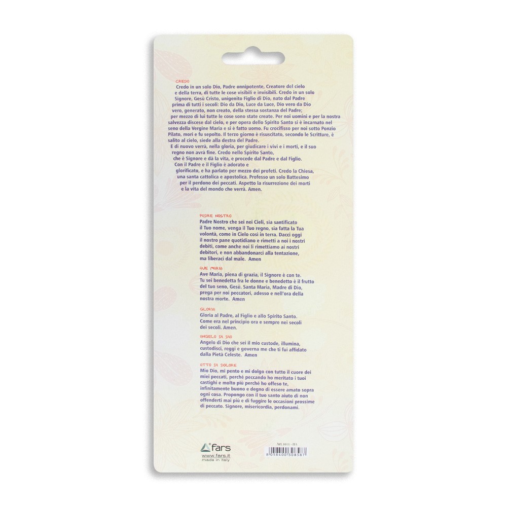 Corredata di cartoncino decorato sul fronte, mentre sul retro vi sono stampati i testi delle preghiere Credo, Padre Nostro, Ave Maria, Gloria, Angelo di DIO e Atto di dolore.