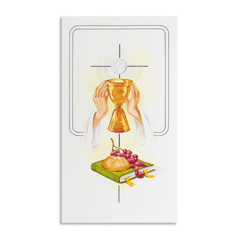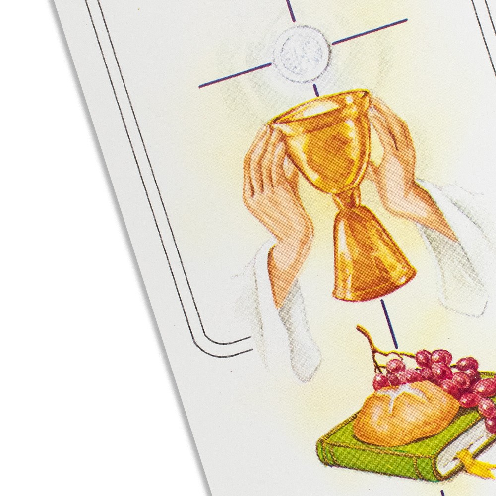 Sul fronte sono stampati i simboli eucaristici, mentre il retro è bianco per poter scrivere e personalizzare il bigliettino.