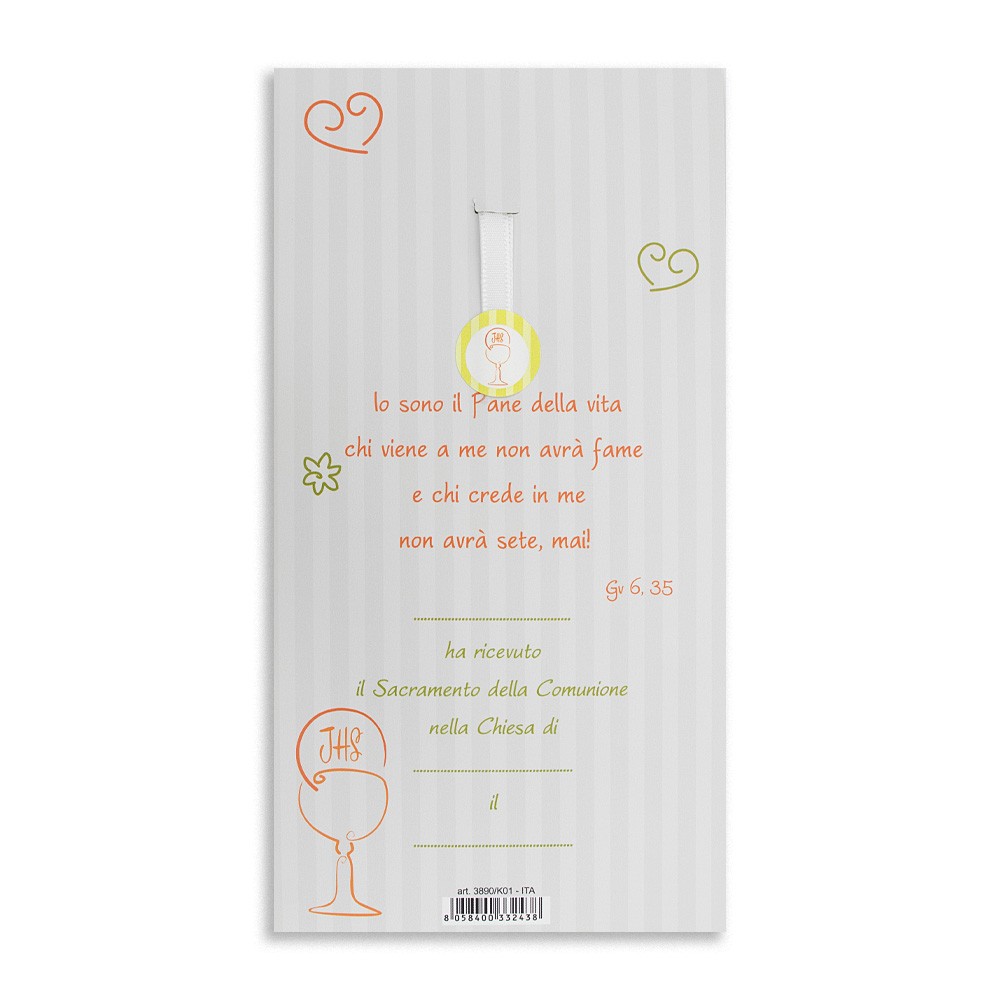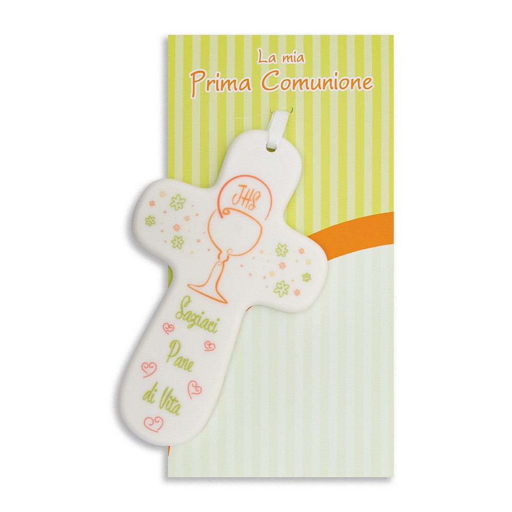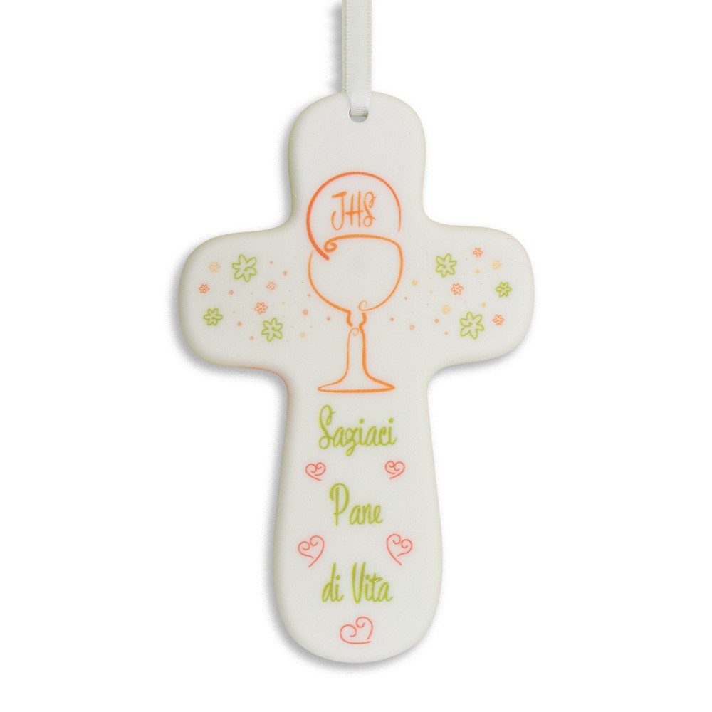 Carinissimo crocifisso dedicato alla Prima Comunione, realizzato in polimero bianco e dipinto con raffinati decori colorati raffiguranti i simboli eucaristici. Al centro è riportato il calice e il simbolo JHS, sotto la frase "Saziaci, Pane di Vita", un messaggio di fede e spiritualità.