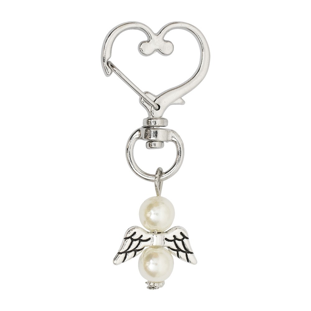 Portachiavi a forma di angelo in metallo e perle, confezionato in bustina trasparente. Un'idea perfetta come segnaposto o ricordino per la Comunione.