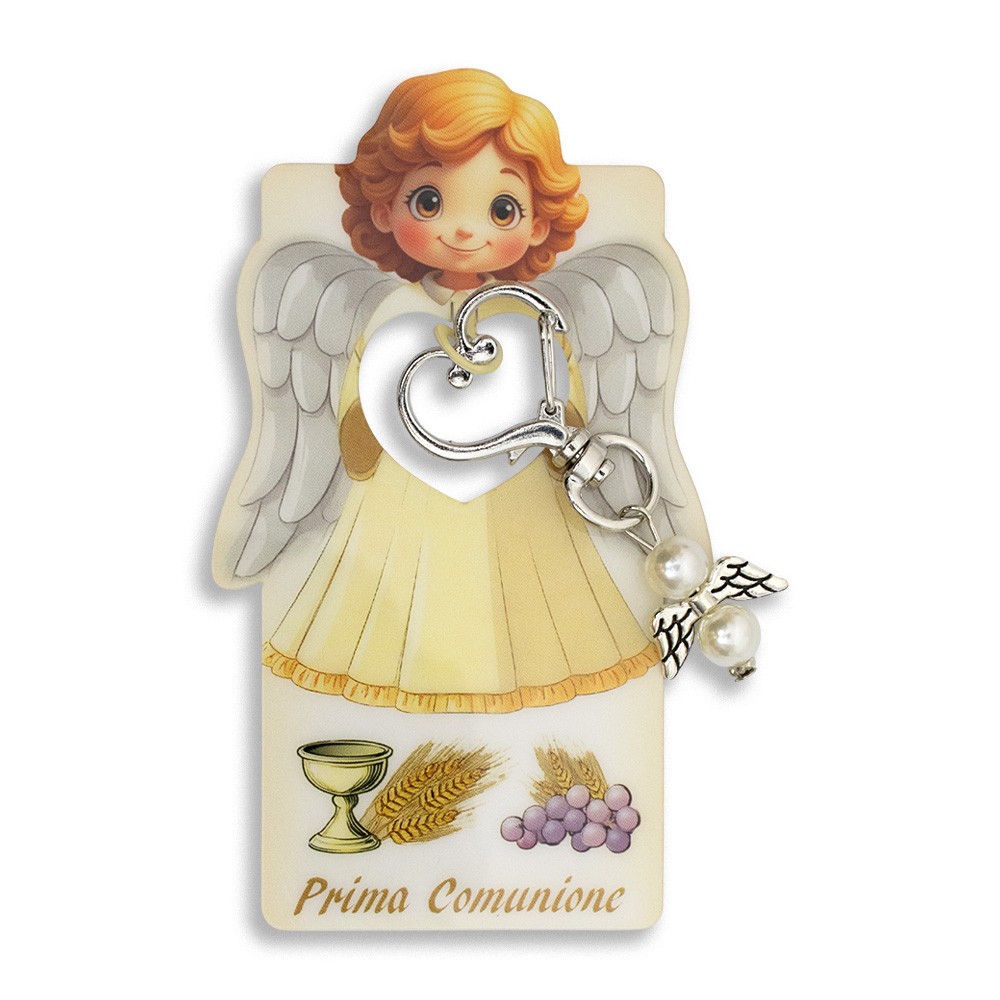 Portachiavi Prima Comunione, realizzato in metallo e decorato con delicate perle, ideale come simbolo di protezione. Ogni portachiavi è confezionato in una pratica bustina trasparente, accompagnato da una sagoma in plastica a forma di angioletto.