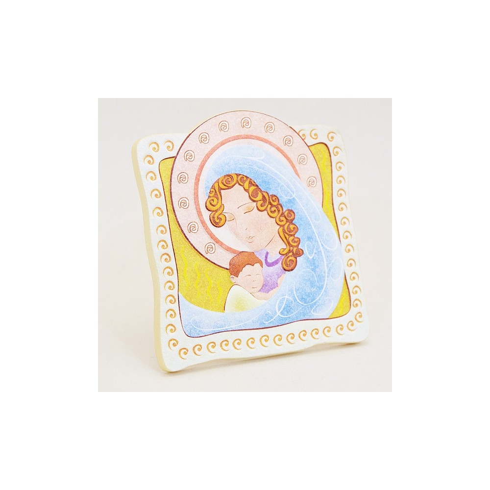 Quadro Madonna con Bambino, da tavolo con piedino in metallo e da parete. Ideale come ricordini per Prima comunione, Prima Confessione e Cresima. Made in Italy. Imbustata.