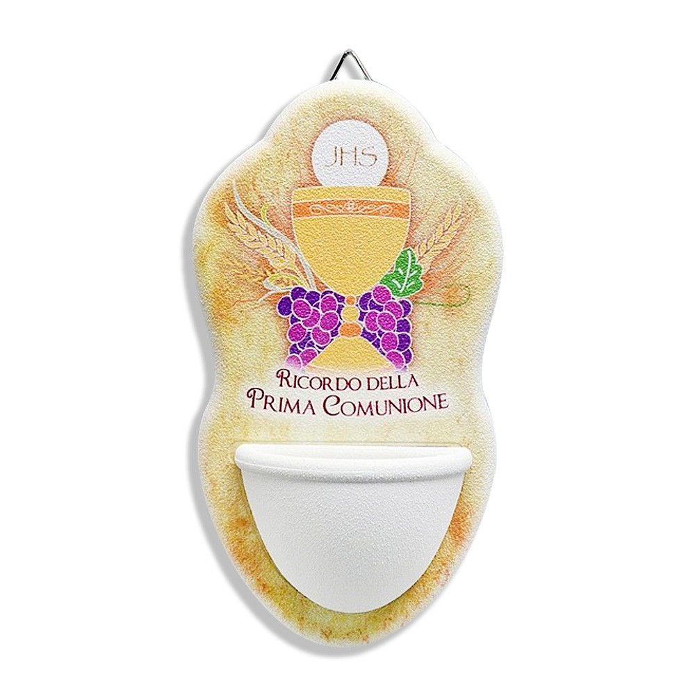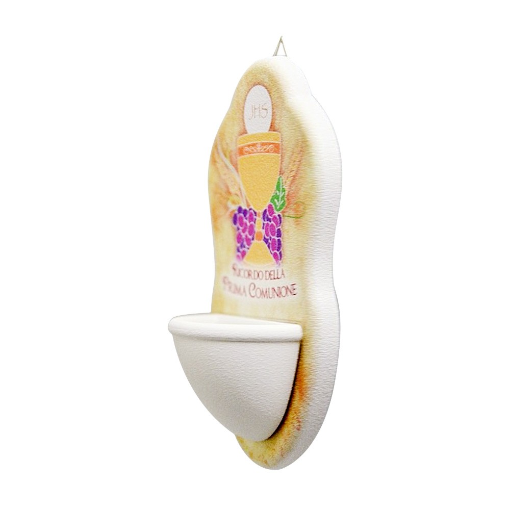 Acquasantiera con effetto pietra con immagine a stampa raffigurante i simboli del Sacramento della Prima Comunione. Scatolato. Ottima idea come bomboniera per il Sacramento della Prima Comunione.