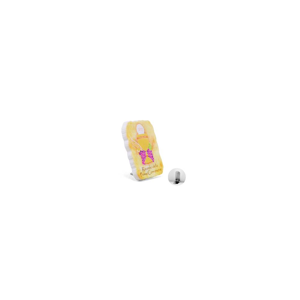 Magnete ricordo raffigurante le immagine del Sacramento della Prima Comunione. Diventa anche quadretto grazie al piedino in metallo presente nella confezione. Made in Italy. Imbustato.