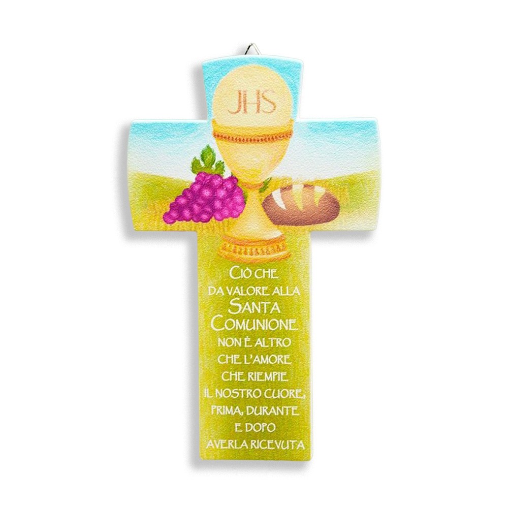 Croce effetto pietra con i simboli riportati della Prima Comunione, l'uva, il pane, il Calice e la particola. Ideale come bomboniera per la Prima Comunione. Made in Italy. Scatolata.