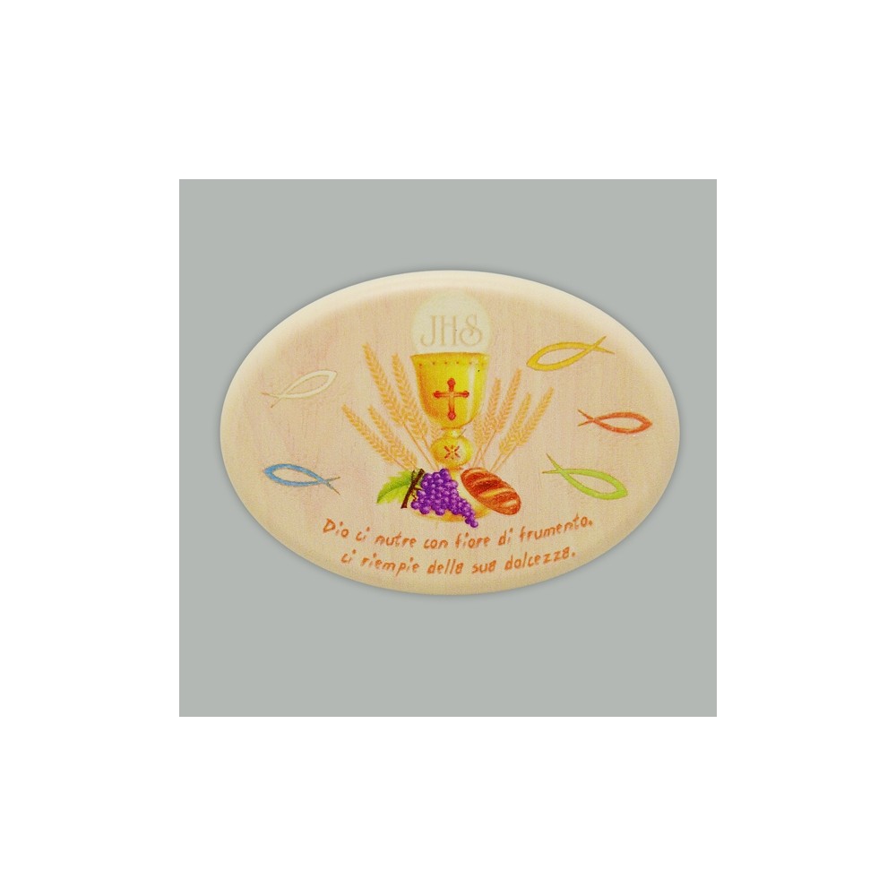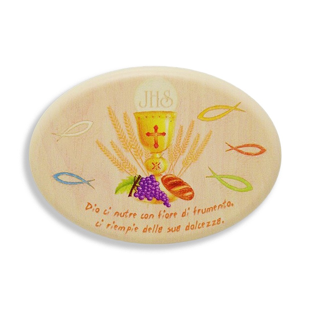 Magnete Prima Comunione a forma ovale tipo legno con decorazioni in rilievo. Il magnete riporta la scritta: " Dio ci nutre con fiore di frumento, ci riempie della sua dolcezza".