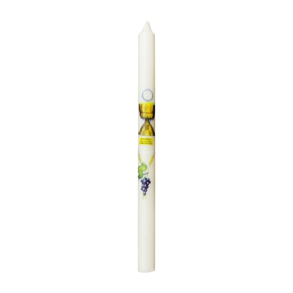 Candelina Prima comunione con immagine del Calice, Spiga e Uva.