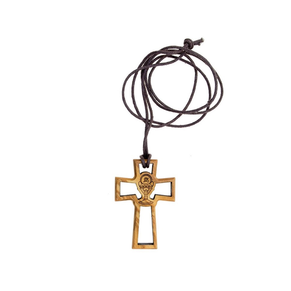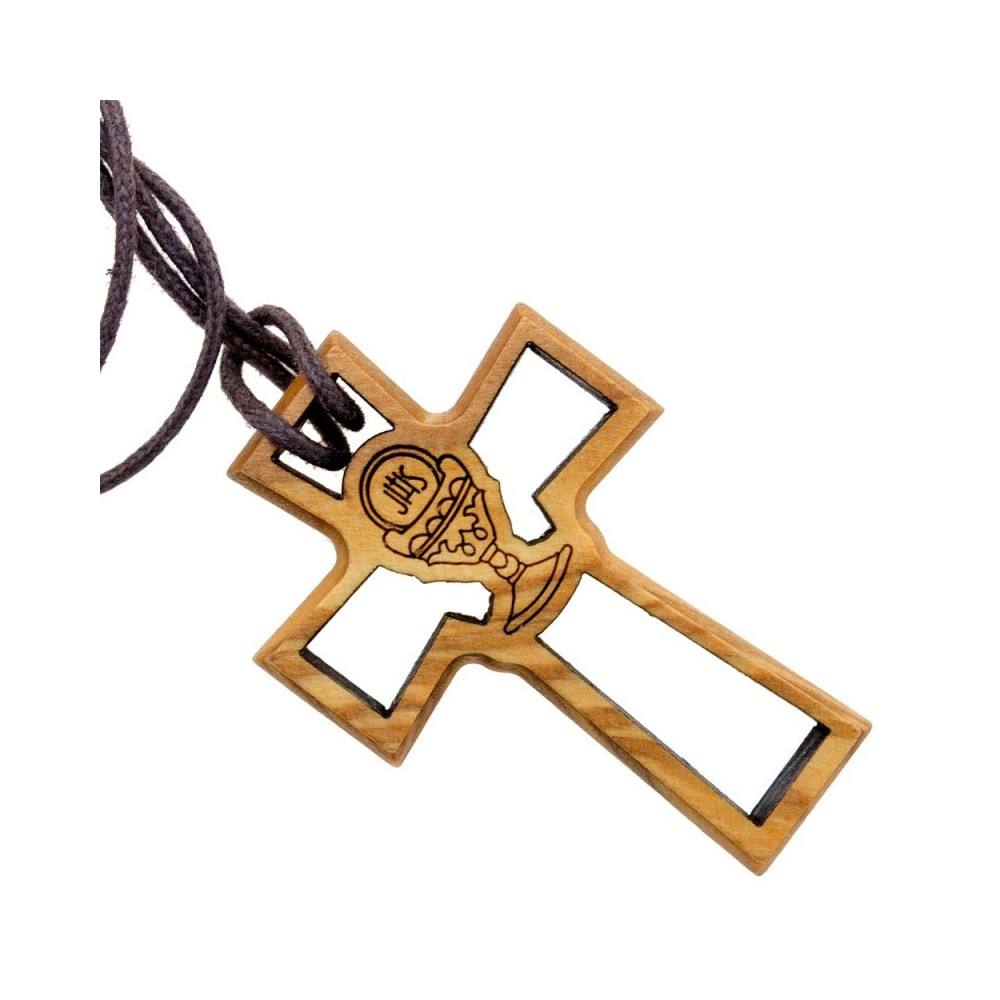 Croce traforata realizzata in legno di ulivo con calice. La croce misura 4,7x3 cm, completa di laccetto in corda di colore marrone.