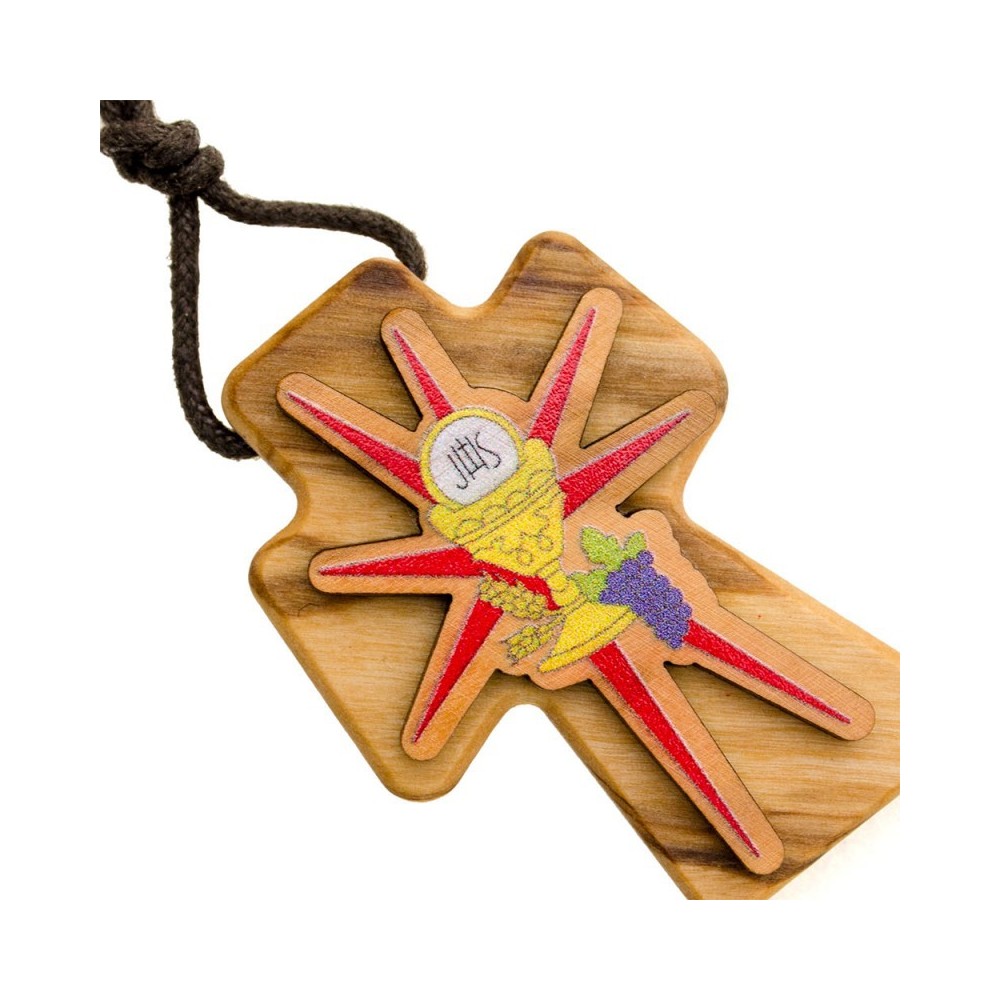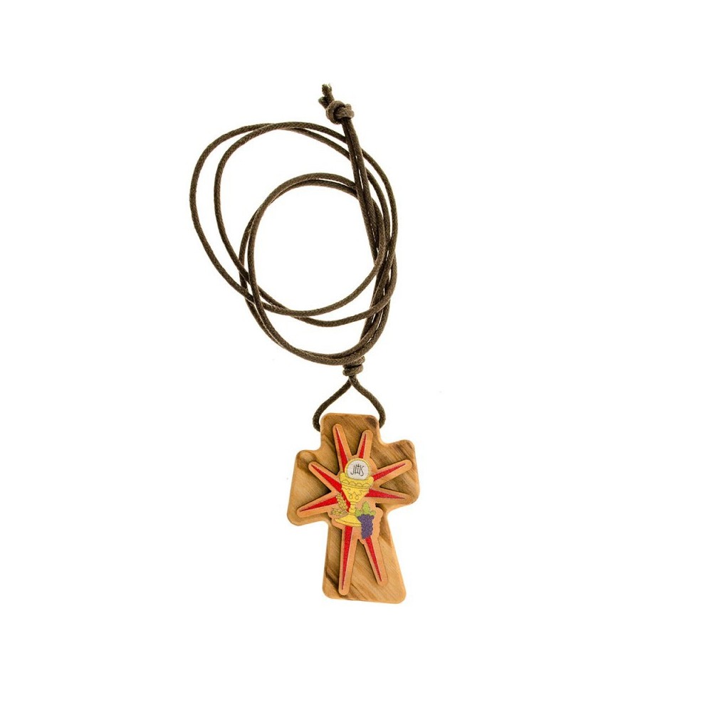 Croce Prima Comunione. Pendente Croce realizzata in legno di ulivo con Calice in rilievo. Completa di laccetto marrone. Può essere regalata ai bambini in ricordo del sacramento. Imbustata singolarmente.