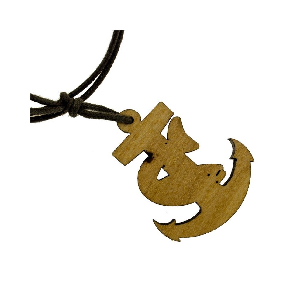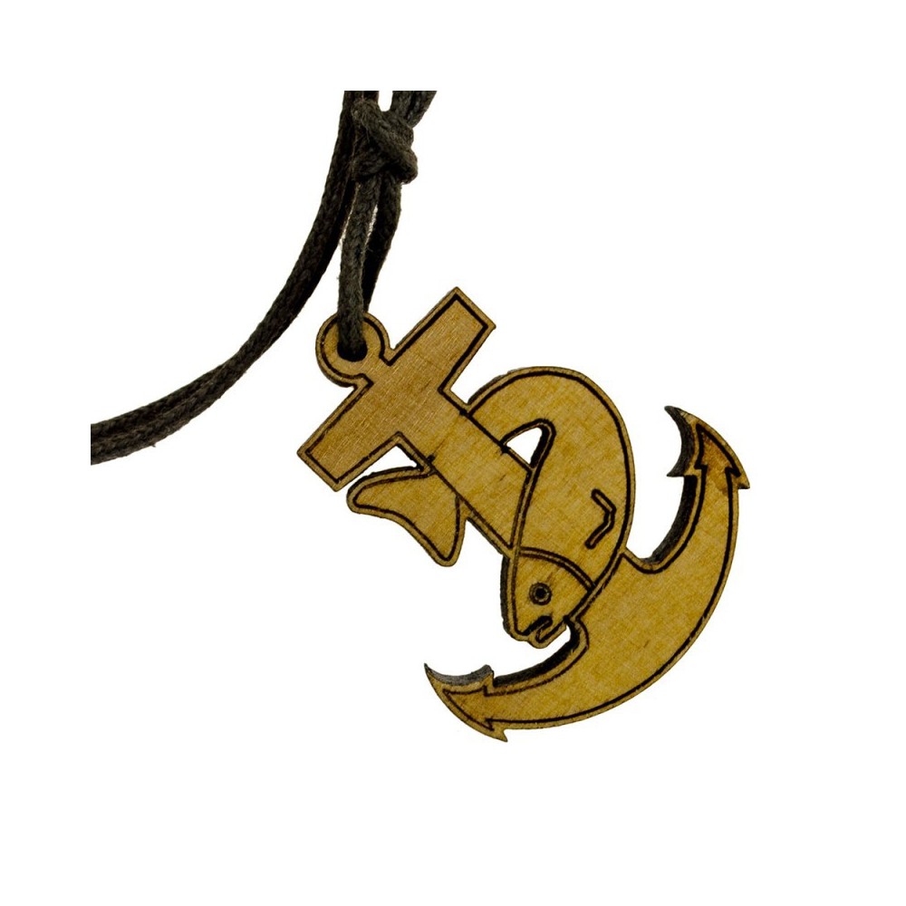 Ciondolo in legno di ulivo, raffigurato l'ancora e il pesce. Completo di cordino marrone. Il ciondolo è alto 3,5 cm. Made in Italy.