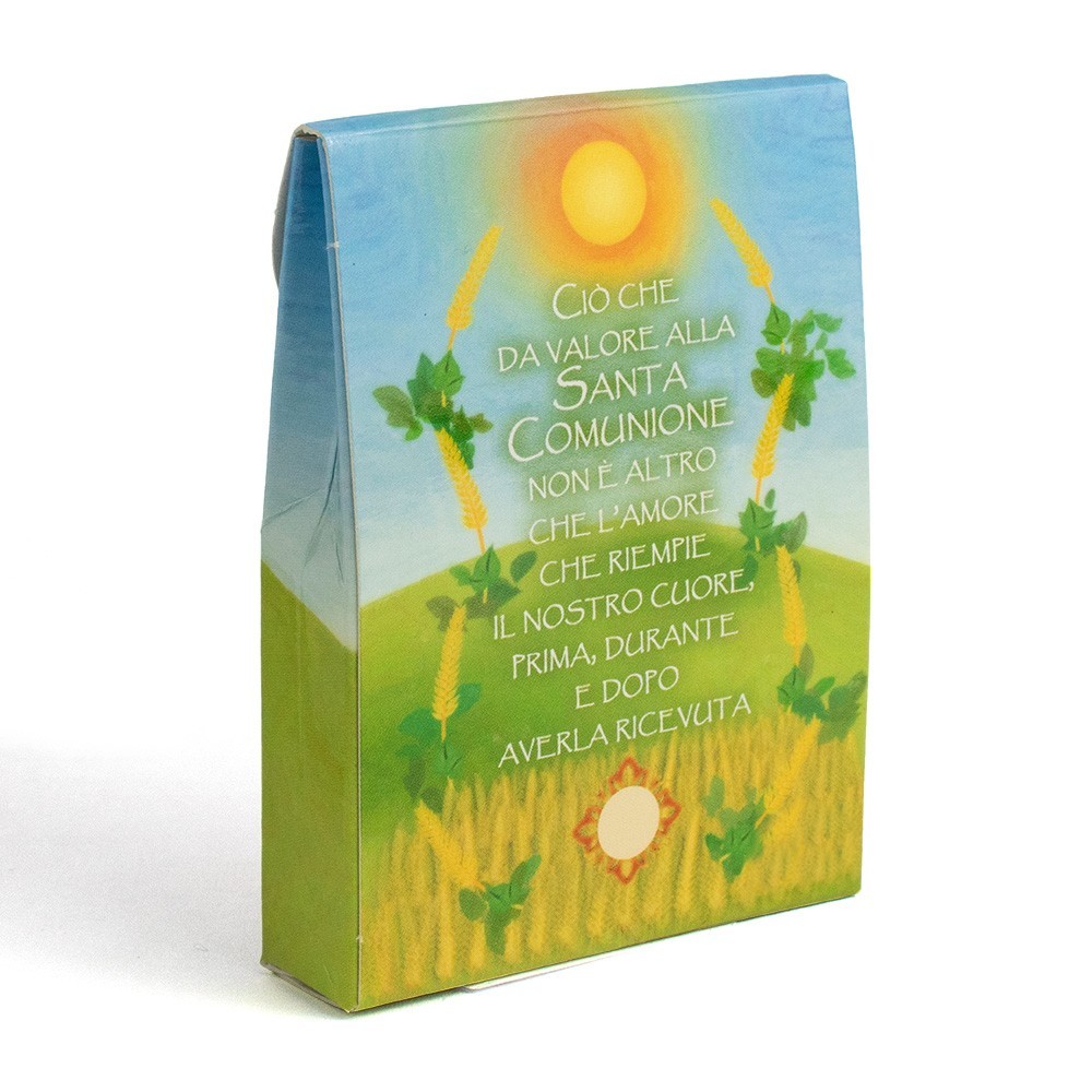 Ricordino Prima Comunione. La confezione è completa di scatola con coroncina colorata all'interno con i simboli del sacramento della Prima Comunione.