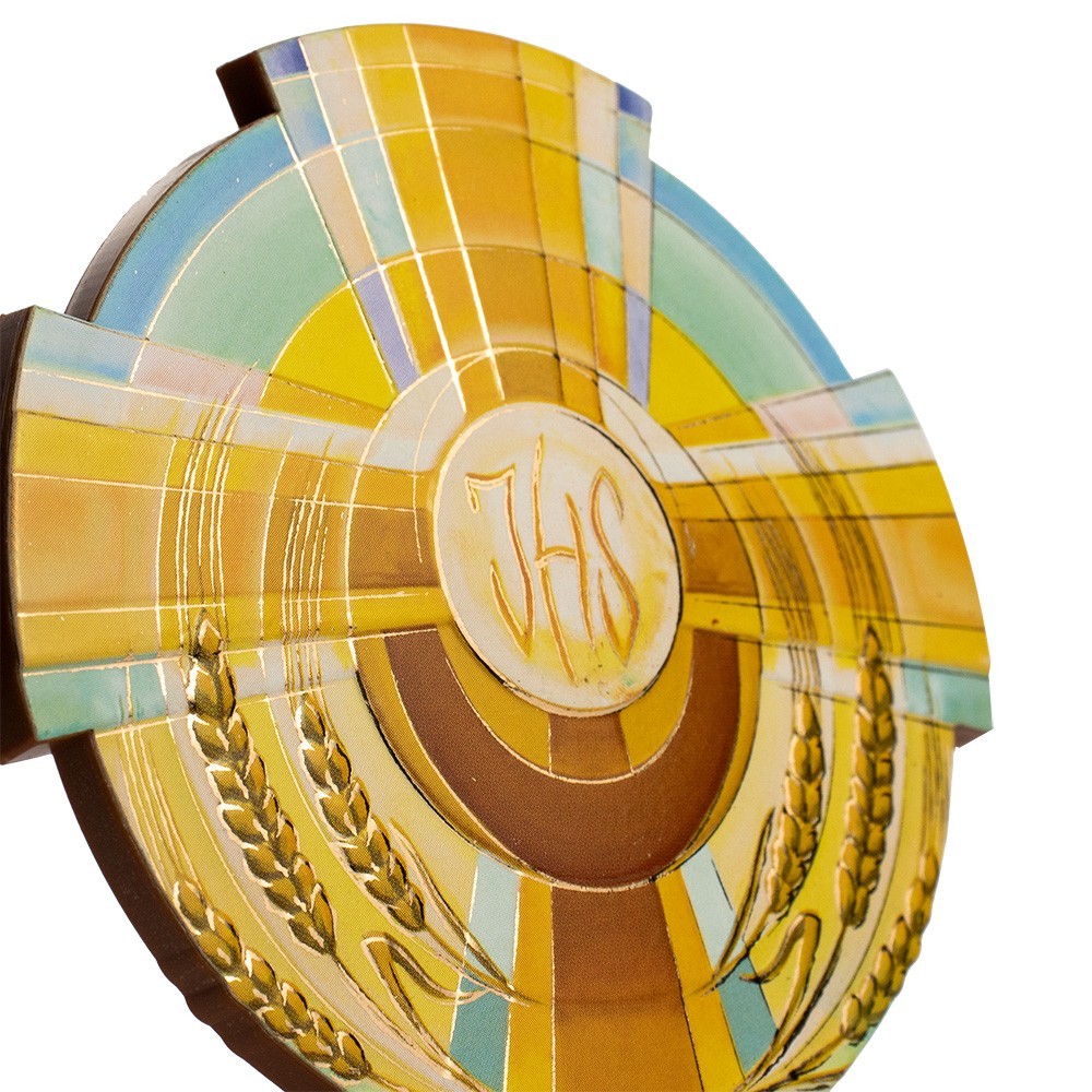 Quadretto sagomato, un grazioso ricordino da regalare ai bambini il giorno della loro Prima Comunione. Realizzato in polimero con immagine oro a caldo raffigurante il Sacramento della Prima Comunione. Dotato di triangolino in metallo dorato per poterlo appendere al muro e piedino in polimero per essere appoggiato.