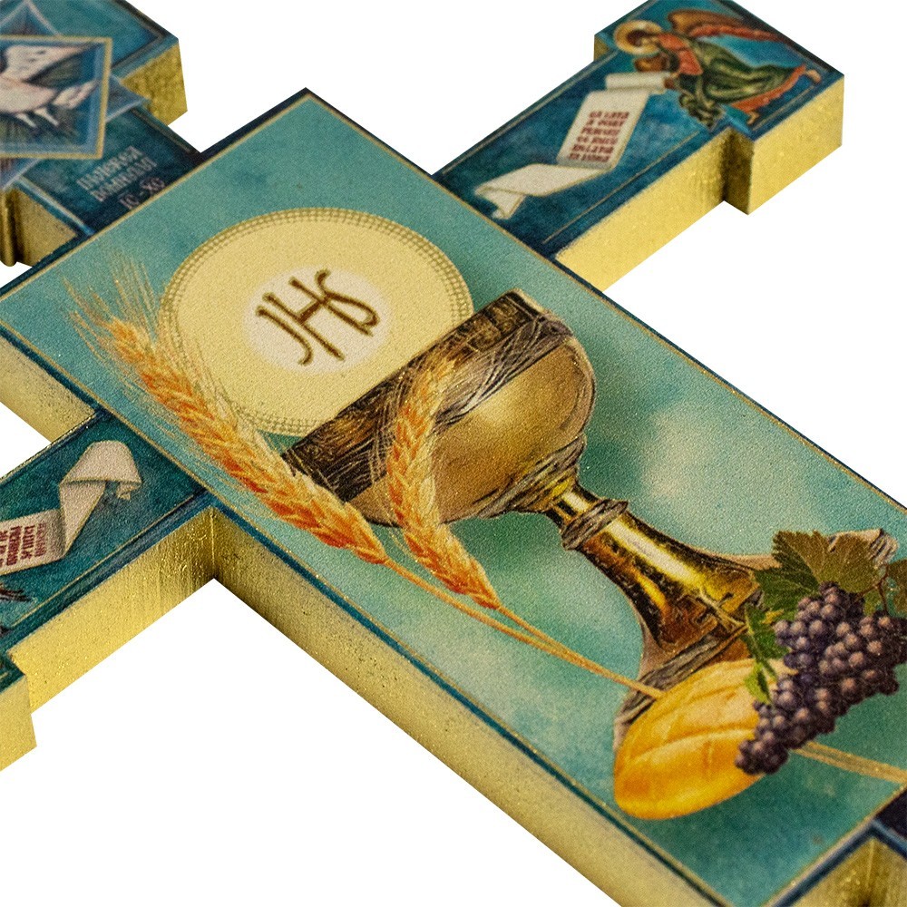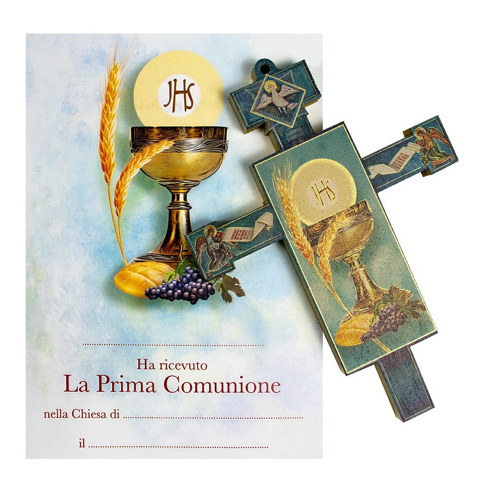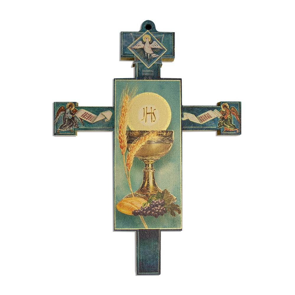 La croce è realizzata in legno con decori stampati raffiguranti i simboli del Sacramento della Prima Comunione. La croce è fornita con foro per poterla appendere alla parete. Confezionata in una bustina trasparente assieme ad un piccolo cartoncino come ricordo della Prima Comunione. Made in Italy.
