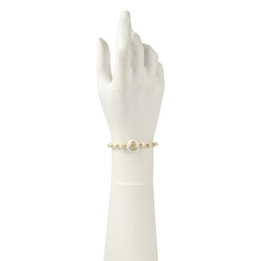 Il bracciale è in corda bianco regolabile, realizzato con perle bianche/dorate e placca tonda in madreperla. Il cartoncino è finemente decorato con i simboli del Sacramento della Prima Comunione.