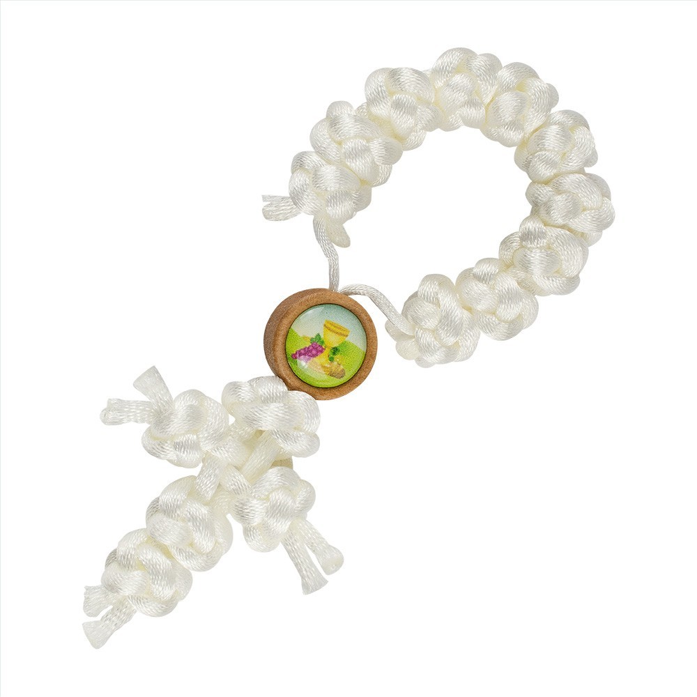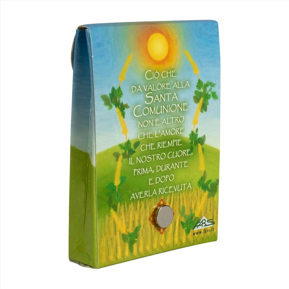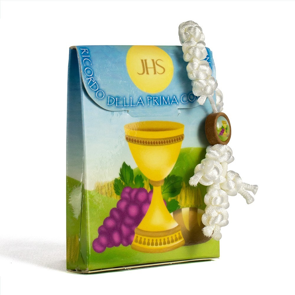 Piccola scatola magnetica in cartoncino colorato con all'interno una graziosa decina a nodi. Dietro alla scatolina vi è incisa una preghiera. Questo oggetto può essere usato sia come ricordino segnaposto o idea regalo per la Prima Comunione.