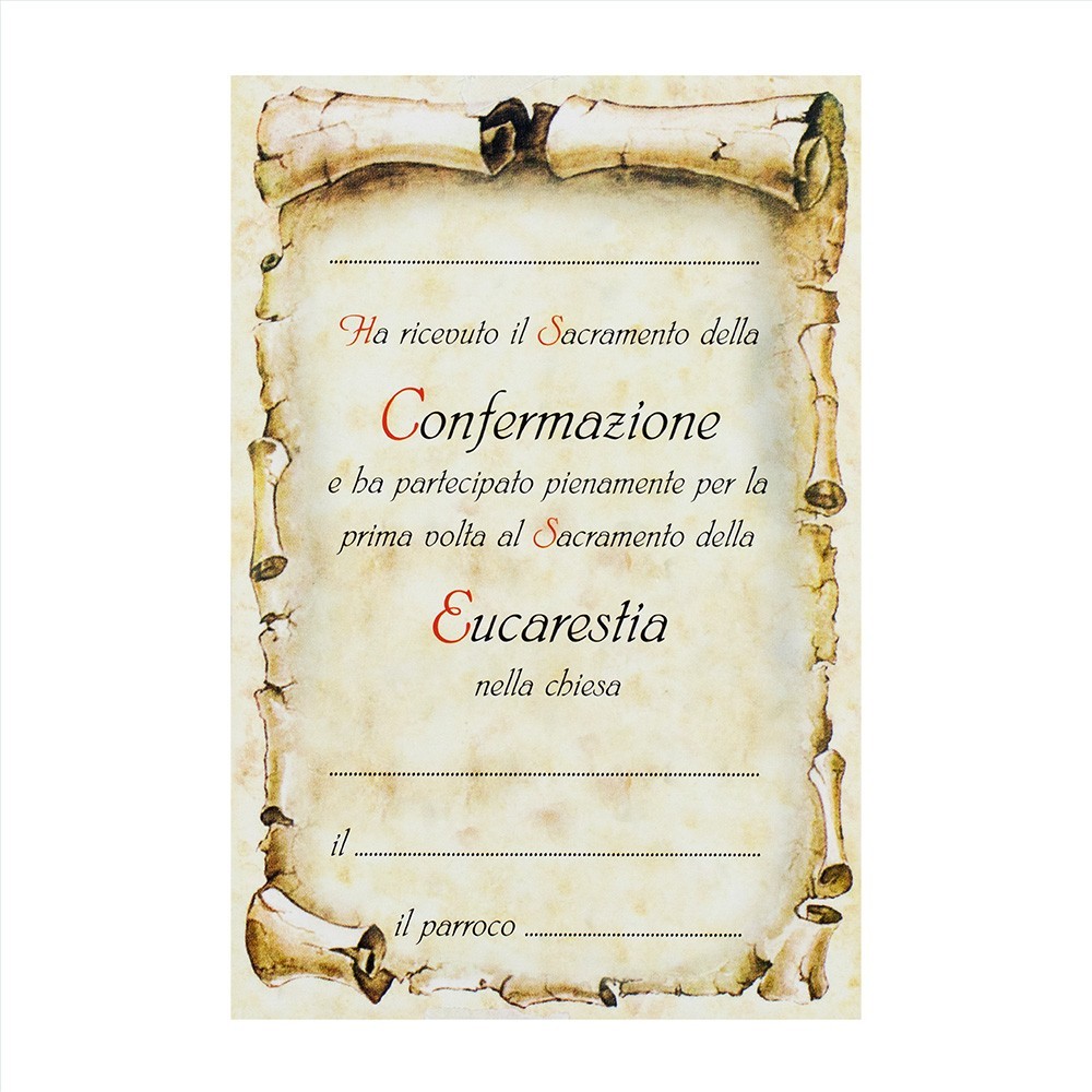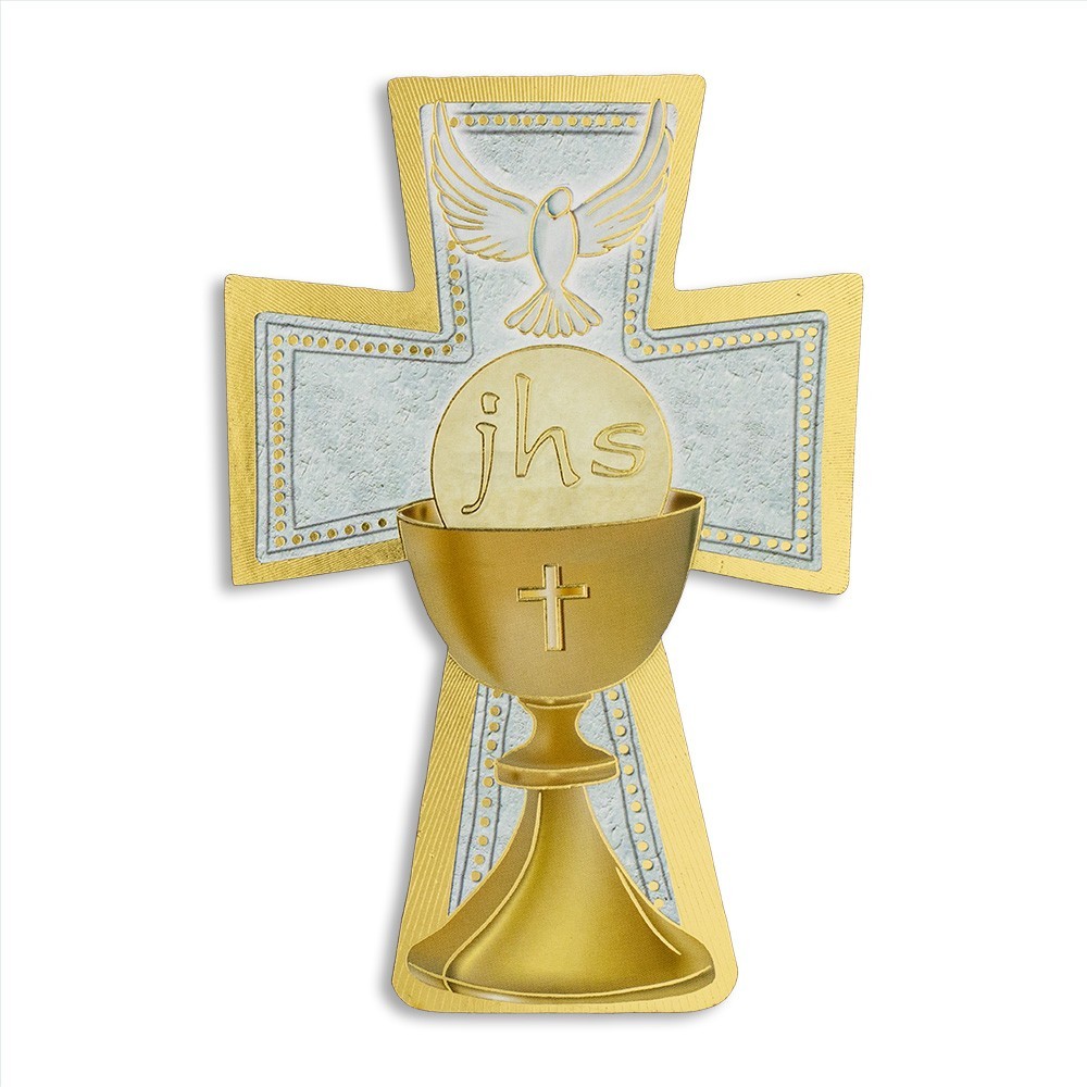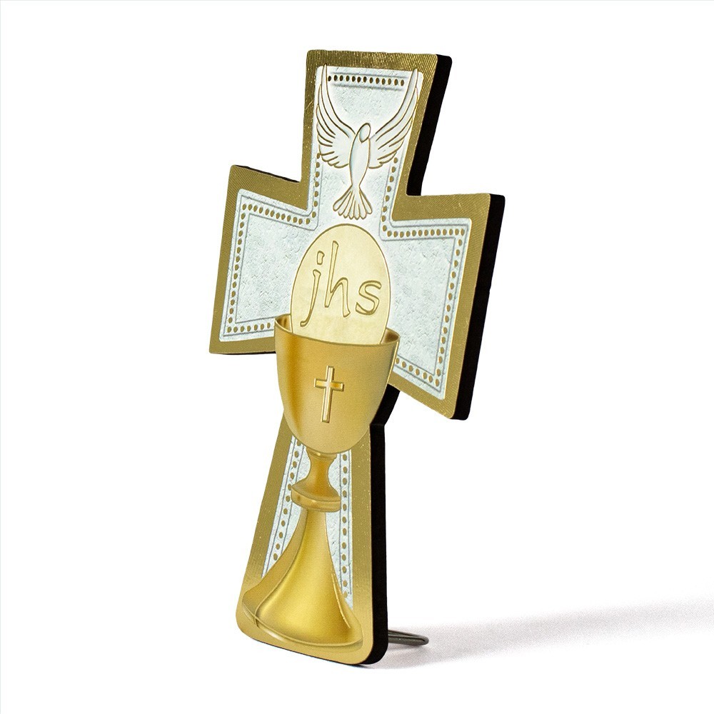 La croce è sagomata realizzata interamente in legno (mdf) con stampa foglia oro, raffiguranti i simboli sia del Sacramento della Prima Comunione che del sacramento della Confermazione. Ogni singola croce è confezionata in bustina trasparente assieme ad un piccolo cartoncino a forma di pergamena. Il prodotto è completo di piedino in metallo per essere appoggiato.