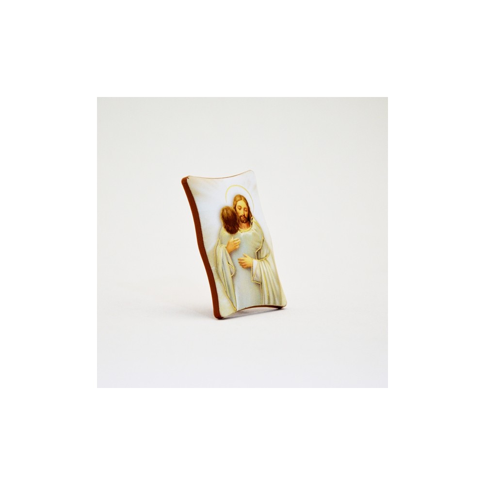 Questo ricordino per la Prima Confessione è inserito in una card, staccabile, con la scritta a Ricordo del Sacramento della Penitenza. La card è larga 11 cm mentre il quadretto con l'immagine dell'abbraccio di Gesù con il bambino è alto 4,5 cm ed è largo 2,5 cm.