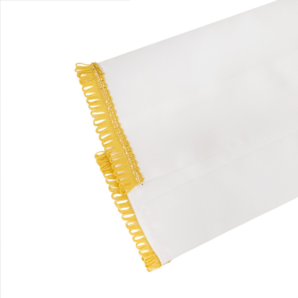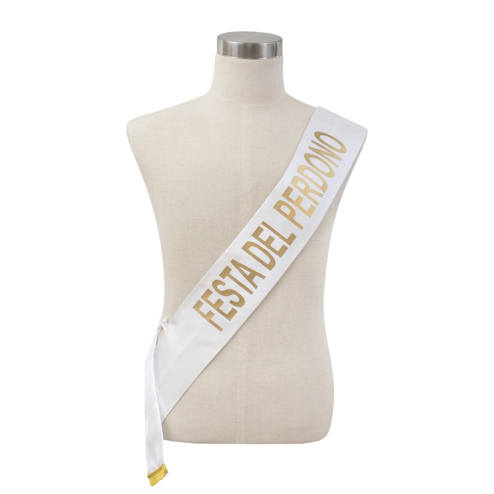 La fascia è in raso bianca con scritta Festa del Perdono e frangia dorata su entrambi i lati.
