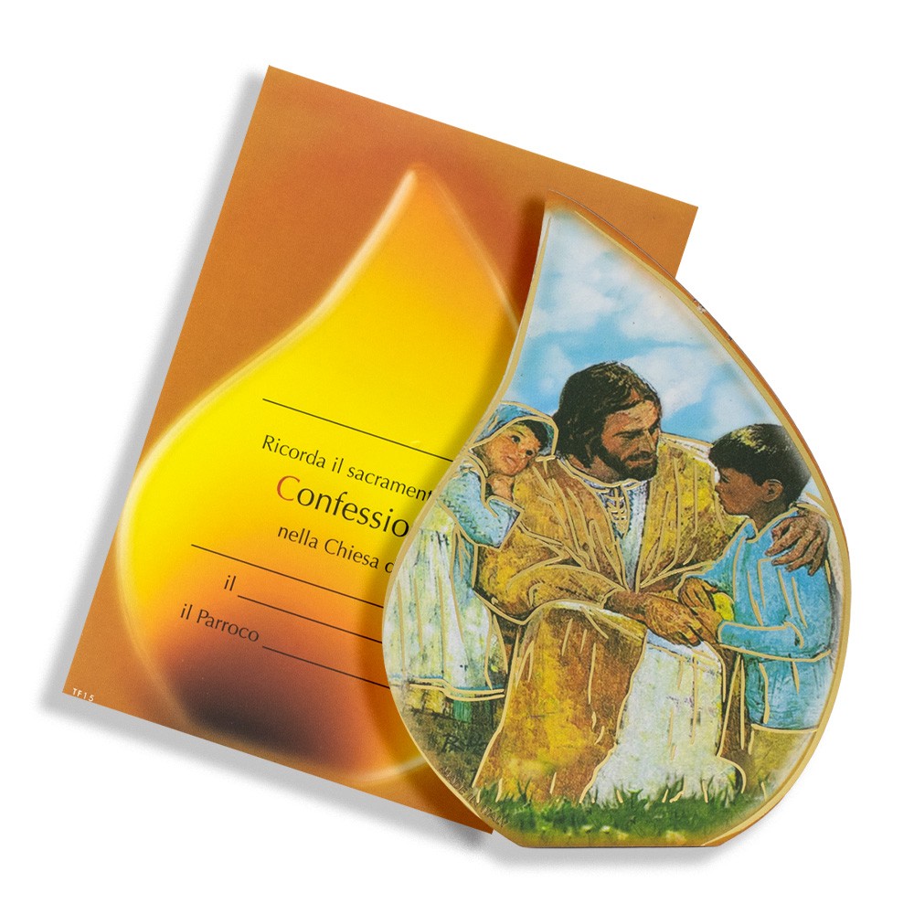 Il quadretto è corredato di piedino d'appoggio in metallo e cartoncino pergamena in ricordo del Prima Confessione.