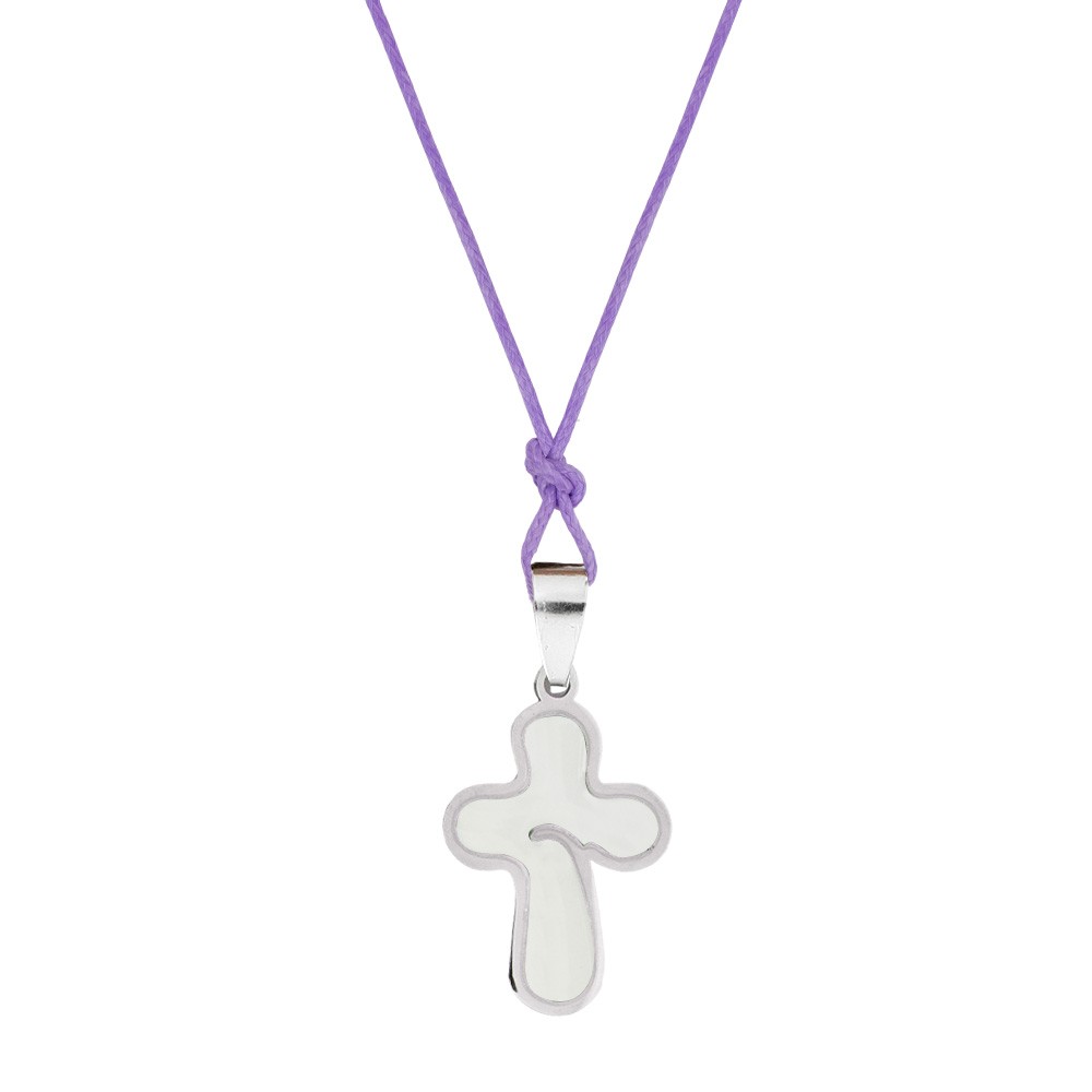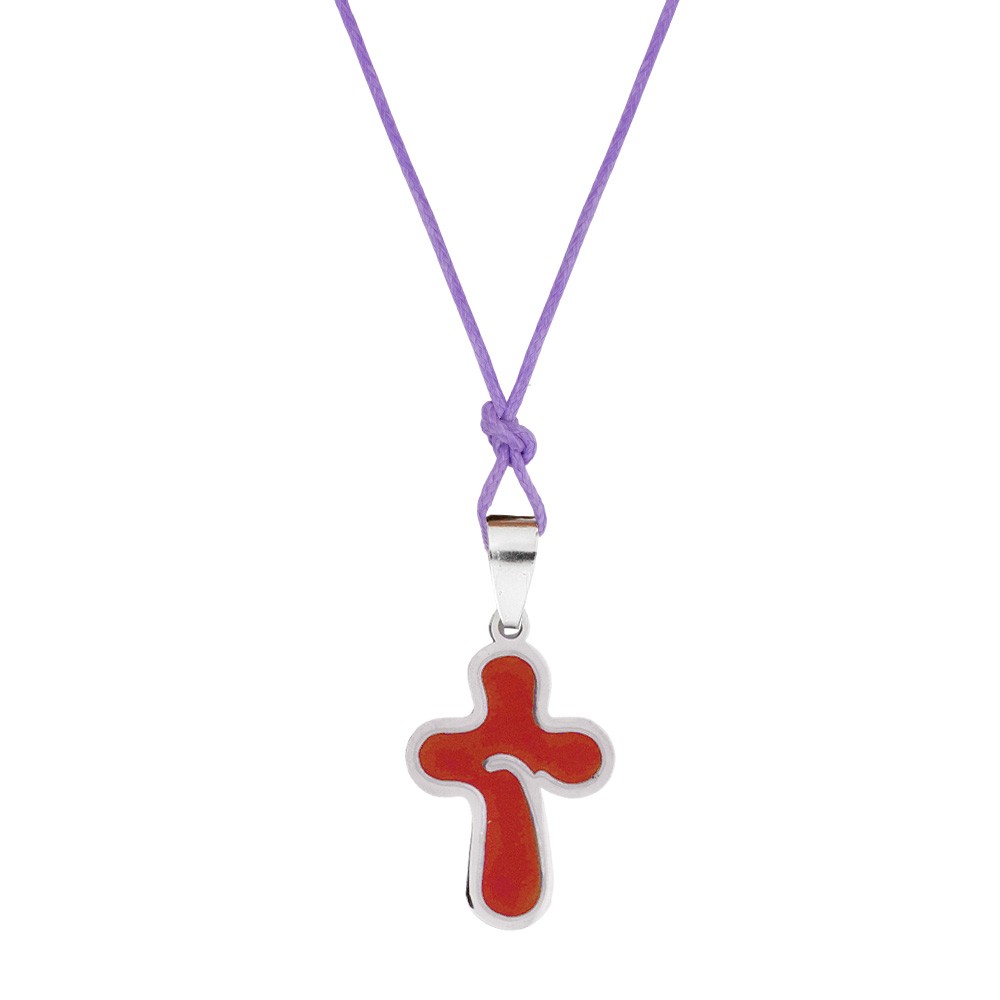 La croce è in acciaio inox con fondo colorato (colori assortiti), munito di cordino viola per poterlo appendere al collo.
