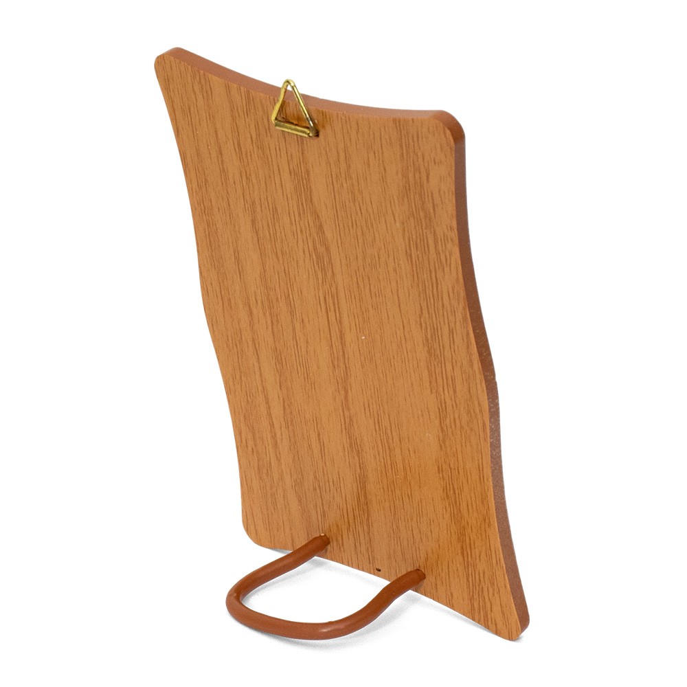 Completo sia di triangolino in metallo dorato per essere appeso che di piedino in plastica per poterlo poggiare.