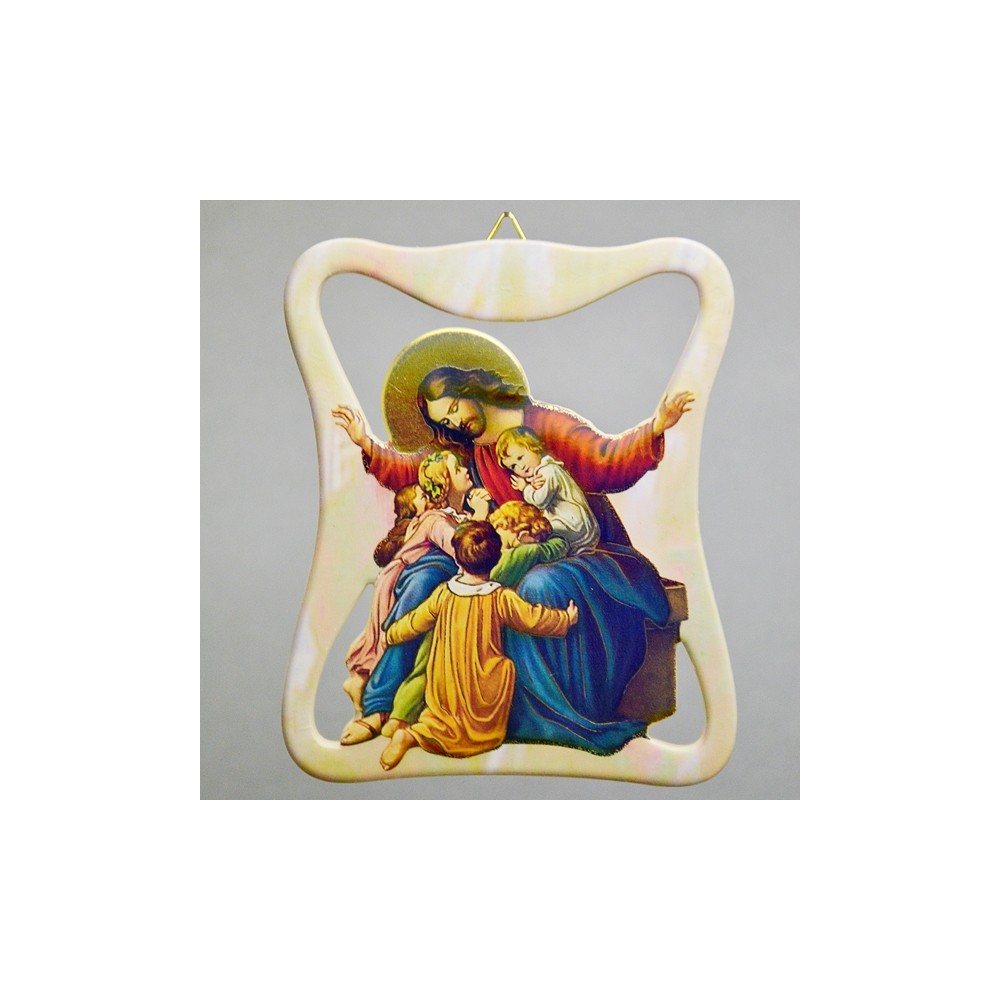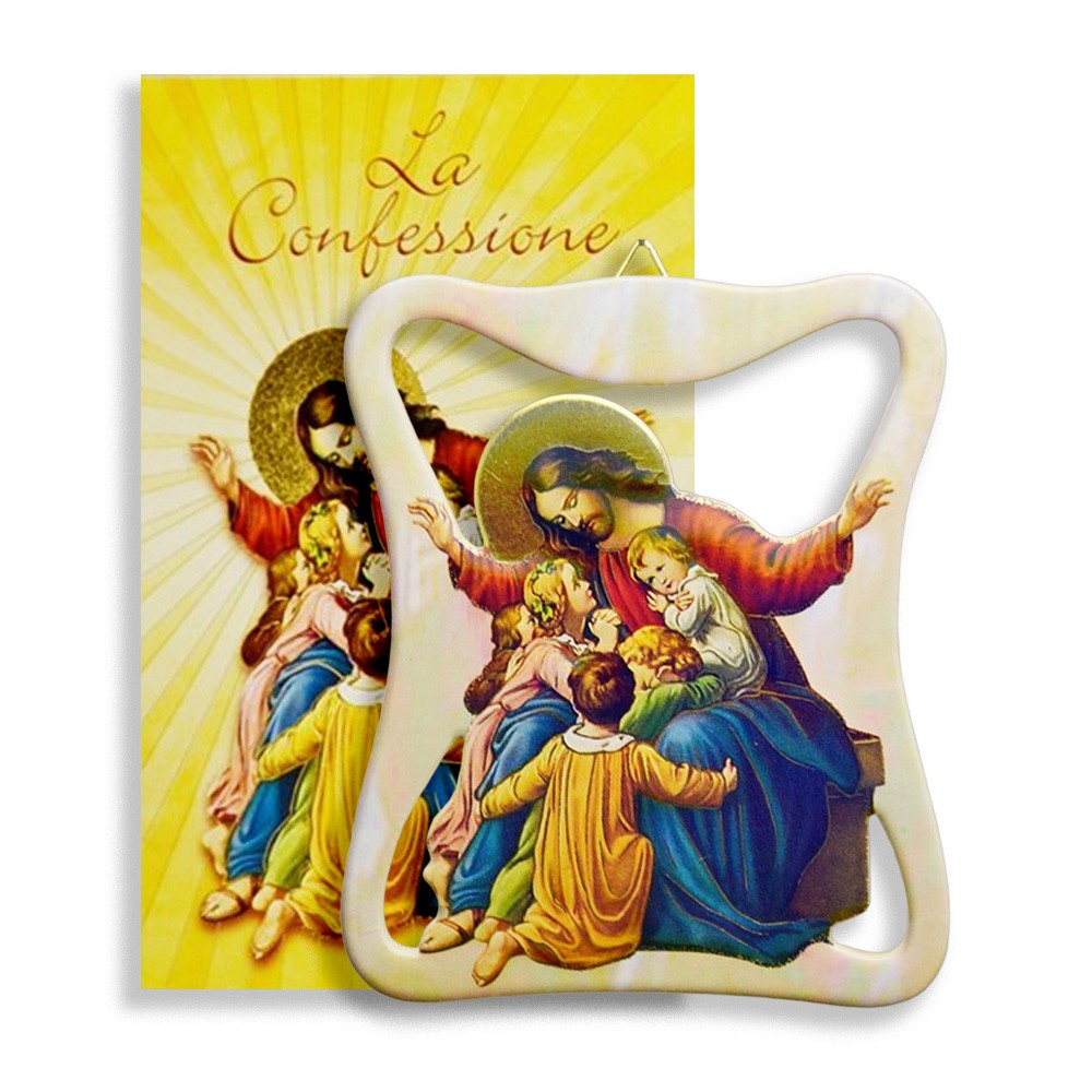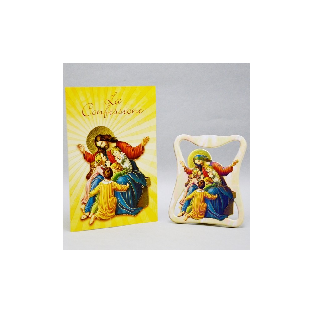 Quadretto traforato con immagine di Gesù con i pargoli raffigurante i simboli del Sacramento della Prima Confessione. Il quadretto può essere usato sia da parete e sia d'appoggio.