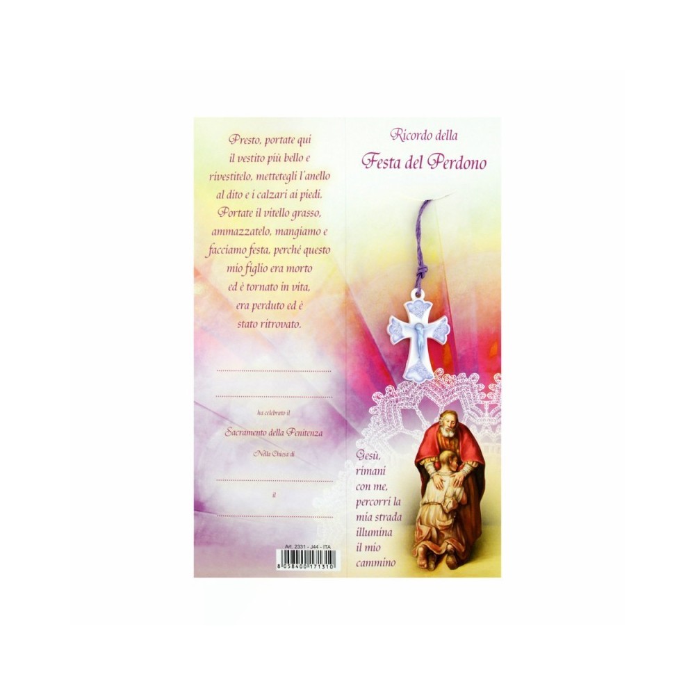 Ricordo della Festa del Perdono. Confezione completa di cartoncino della Confessione con una carinissima croce colorata da collo. Ottima idea regalo per il sacramento della Prima Confessione. Prodotto made in Italy.