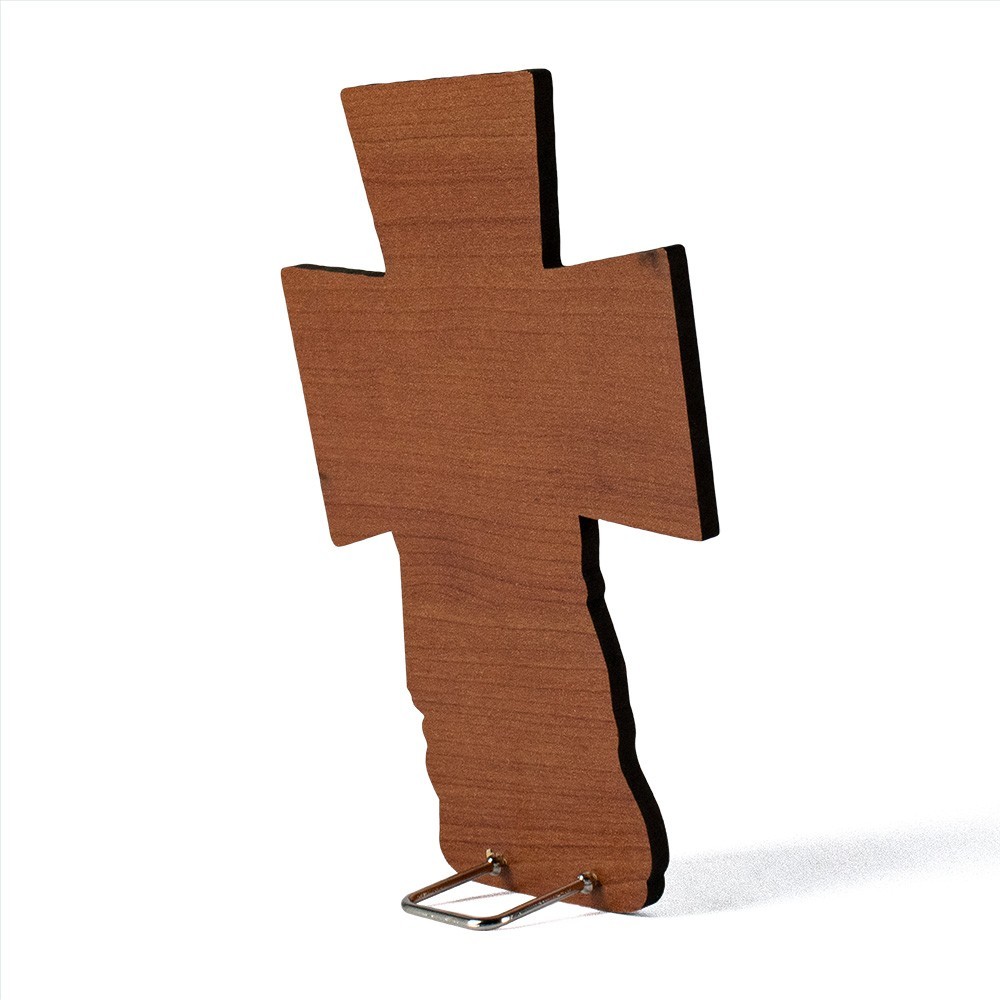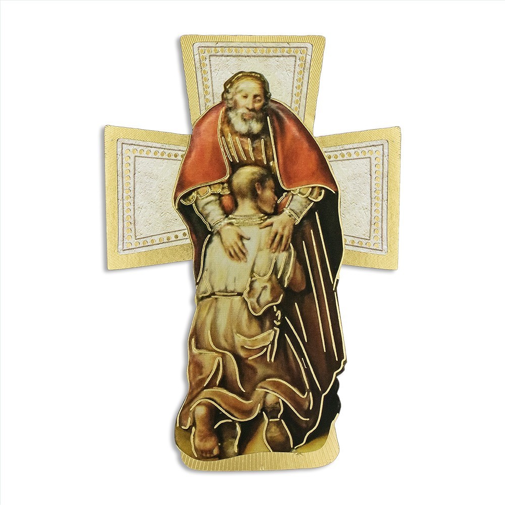 Questa graziosa croce raffigurante il Padre Misericordioso è realizzata con decori in foglia oro ed è munita di piedino in metallo per poterla anche appoggiare. Il tutto confezionato in bustina trasparente assieme ad un cartoncino coordinato dove è possibile scrivere la Chiesa, il giorno, il nome del padrino o della madrina.