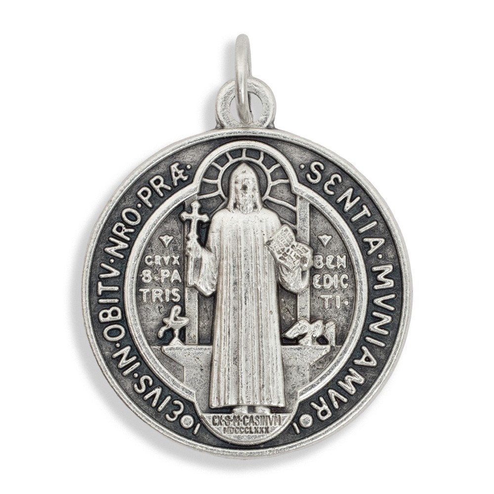 Medaglia di San Benedetto (Ø 2,5 cm) completa di anello apribile, realizzata interamente in metallo finitura argento.