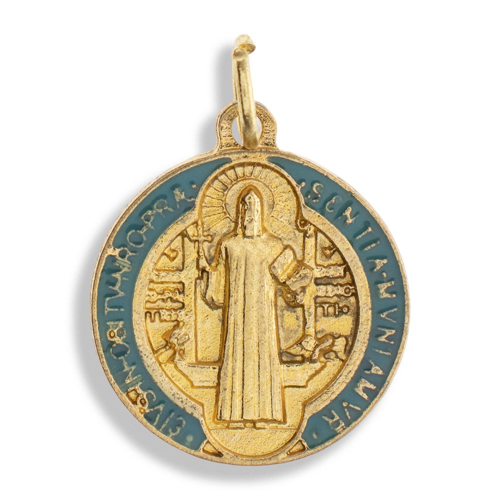 Medaglia di San Benedetto realizzata in metallo con finitura oro e smaltata su entrambi i lati.