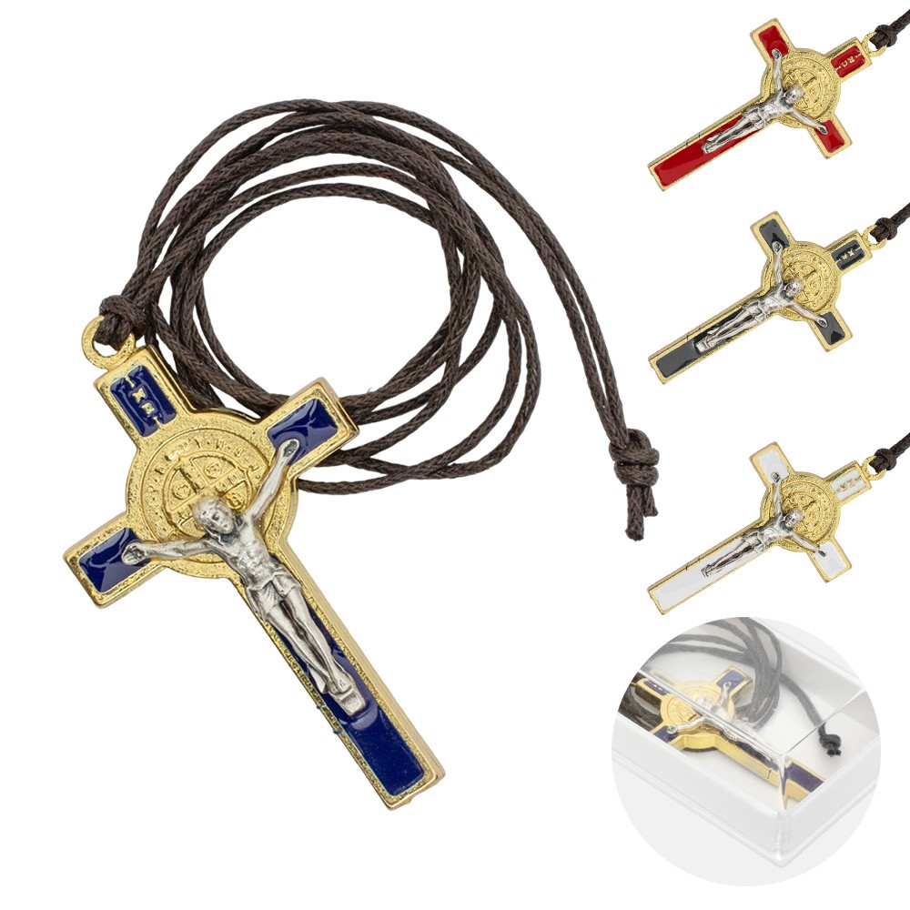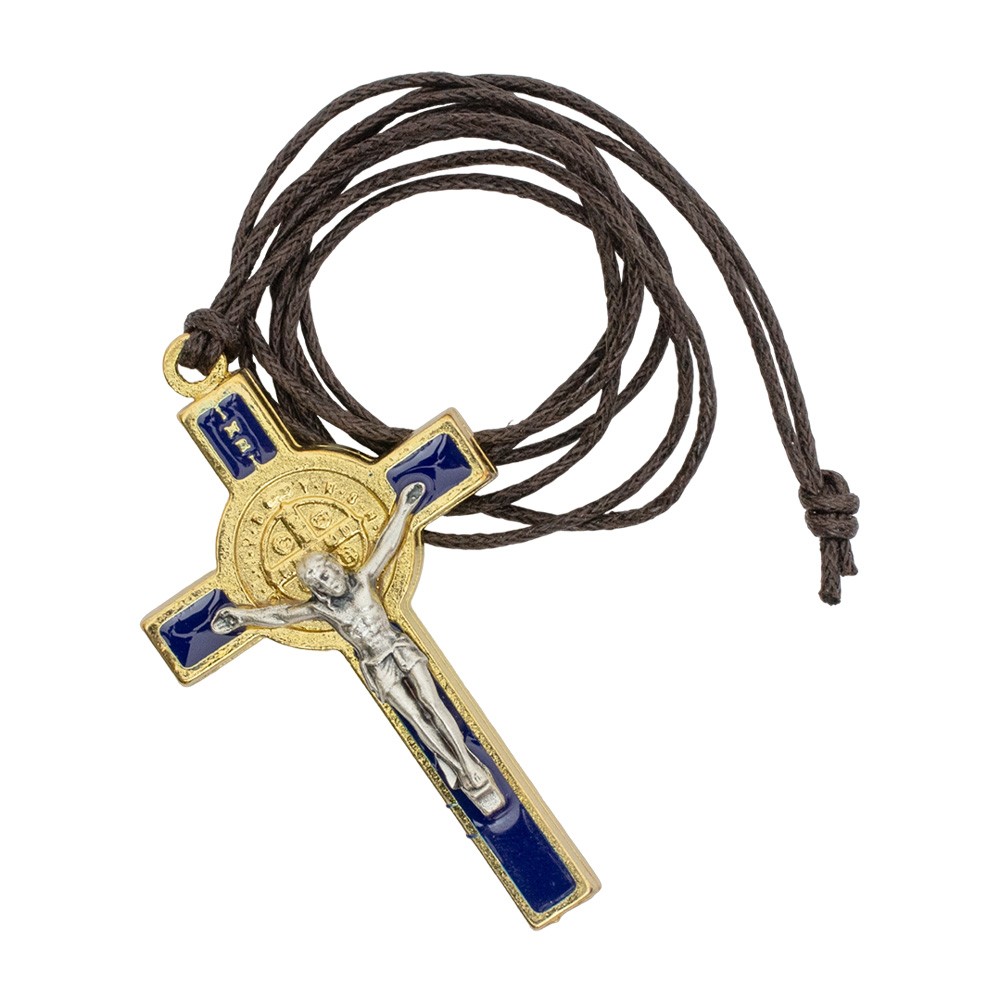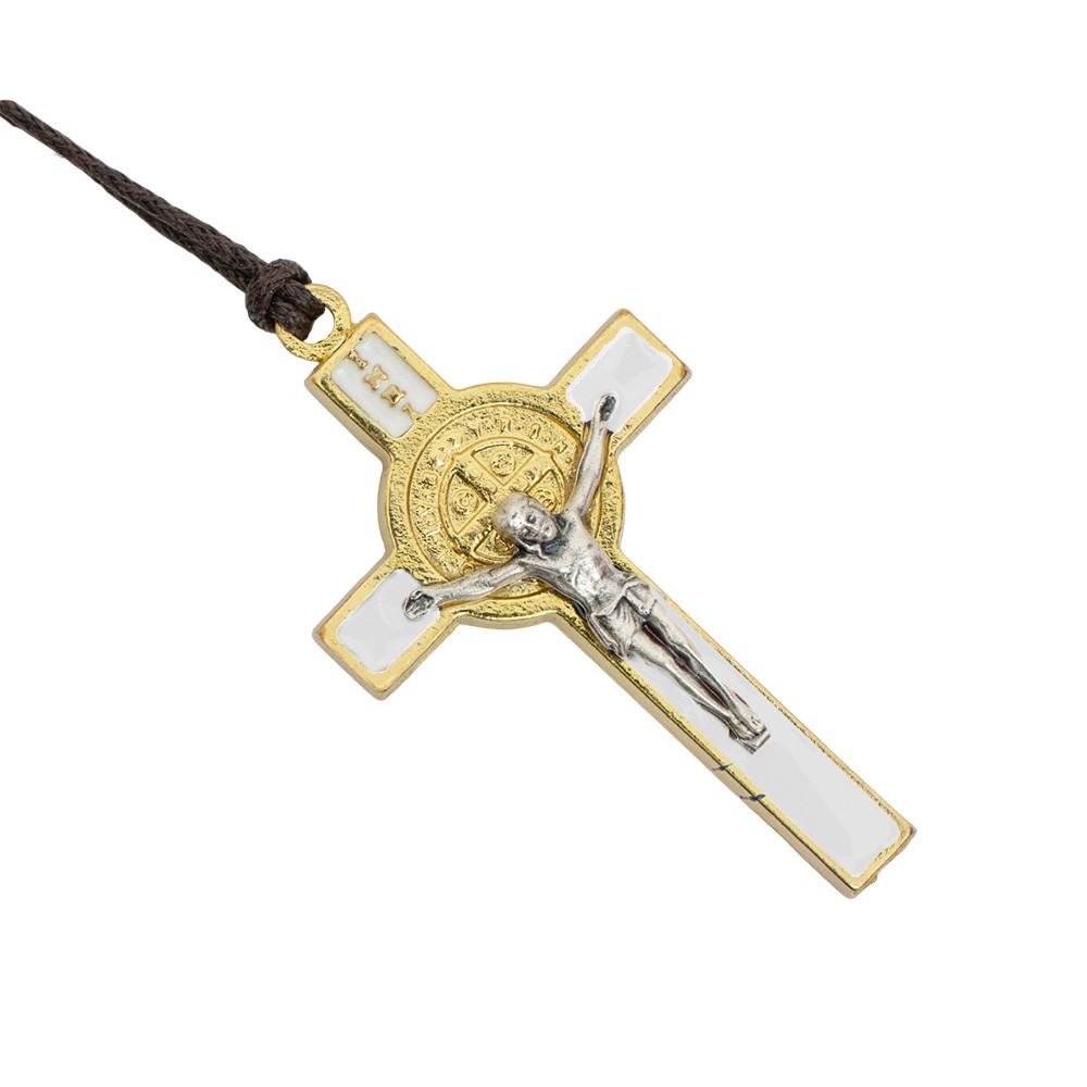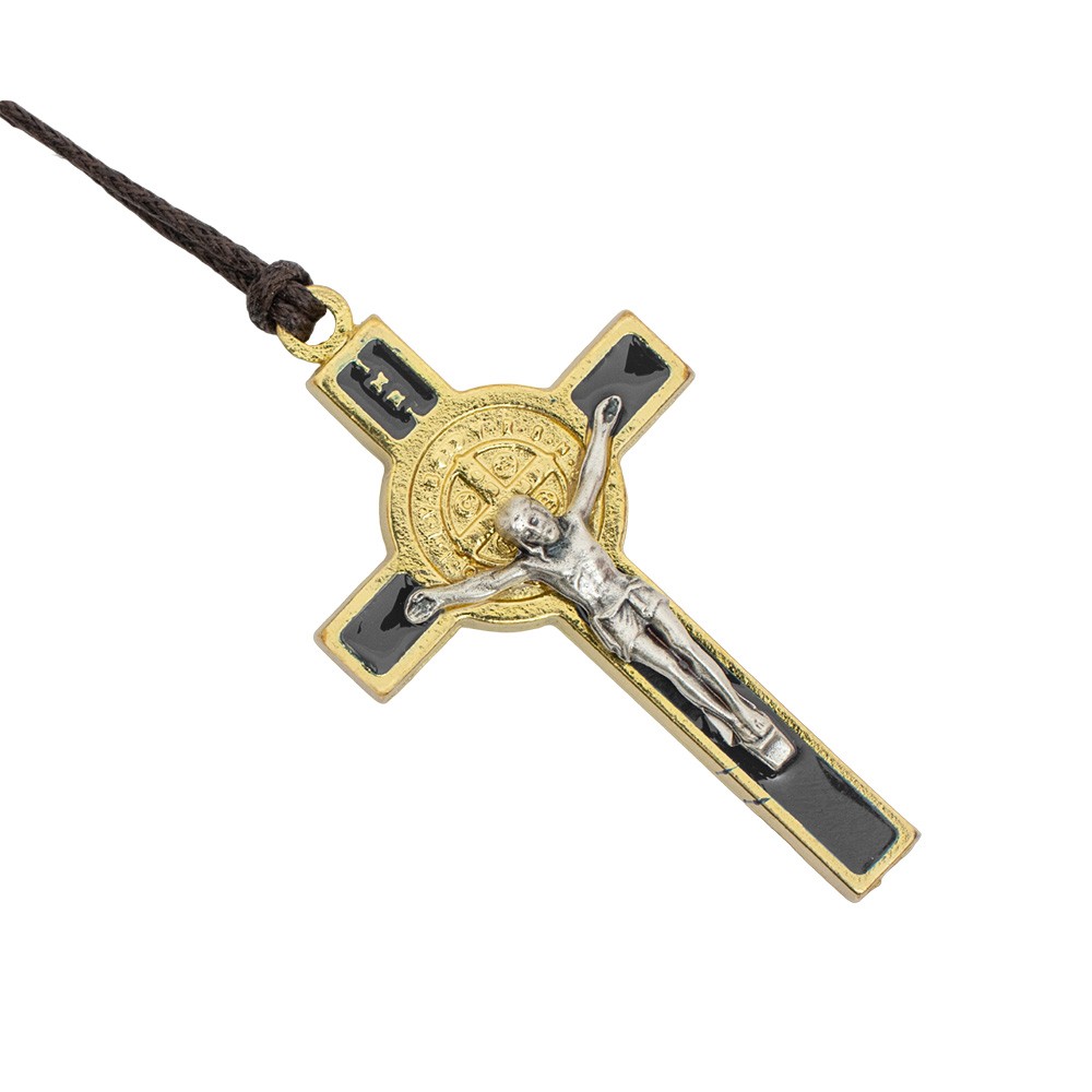 Pendente croce di San Benedetto realizzata in metallo con finitura dorata e smaltata, completa di laccetto marrone.