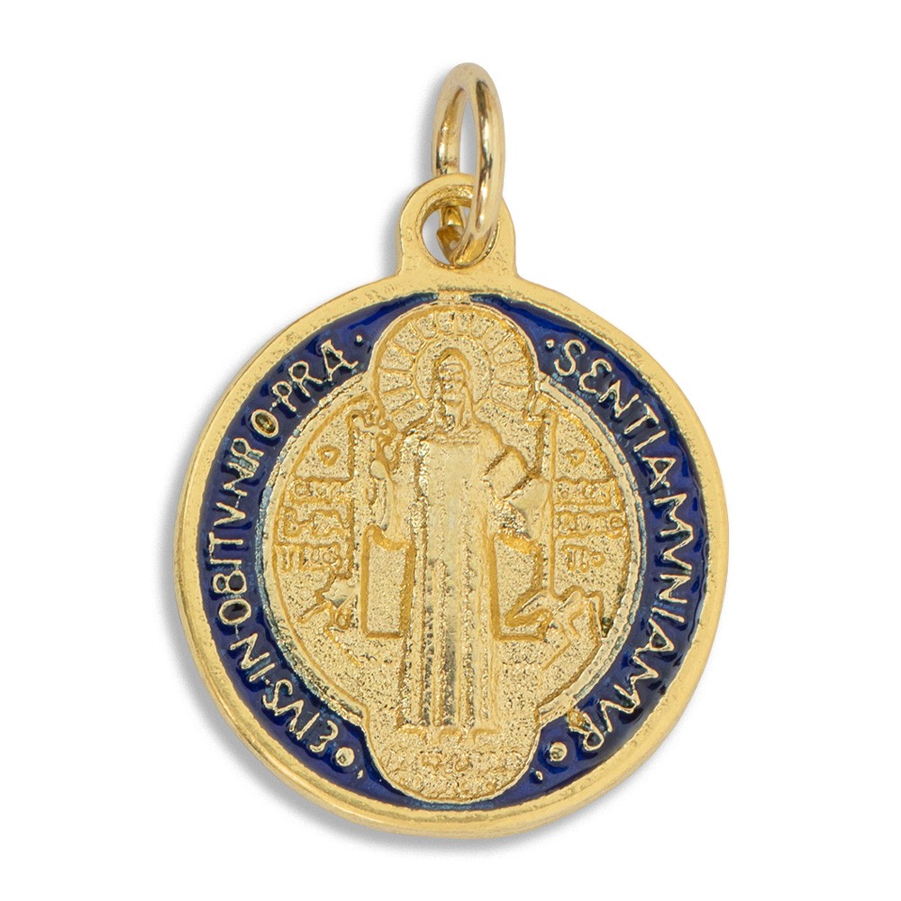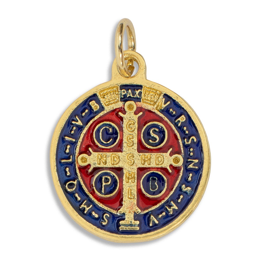 Medaglietta di San Benedetto (Ø 2 cm) realizzata in metallo con finitura dorata e smaltata su entrambi i lati.