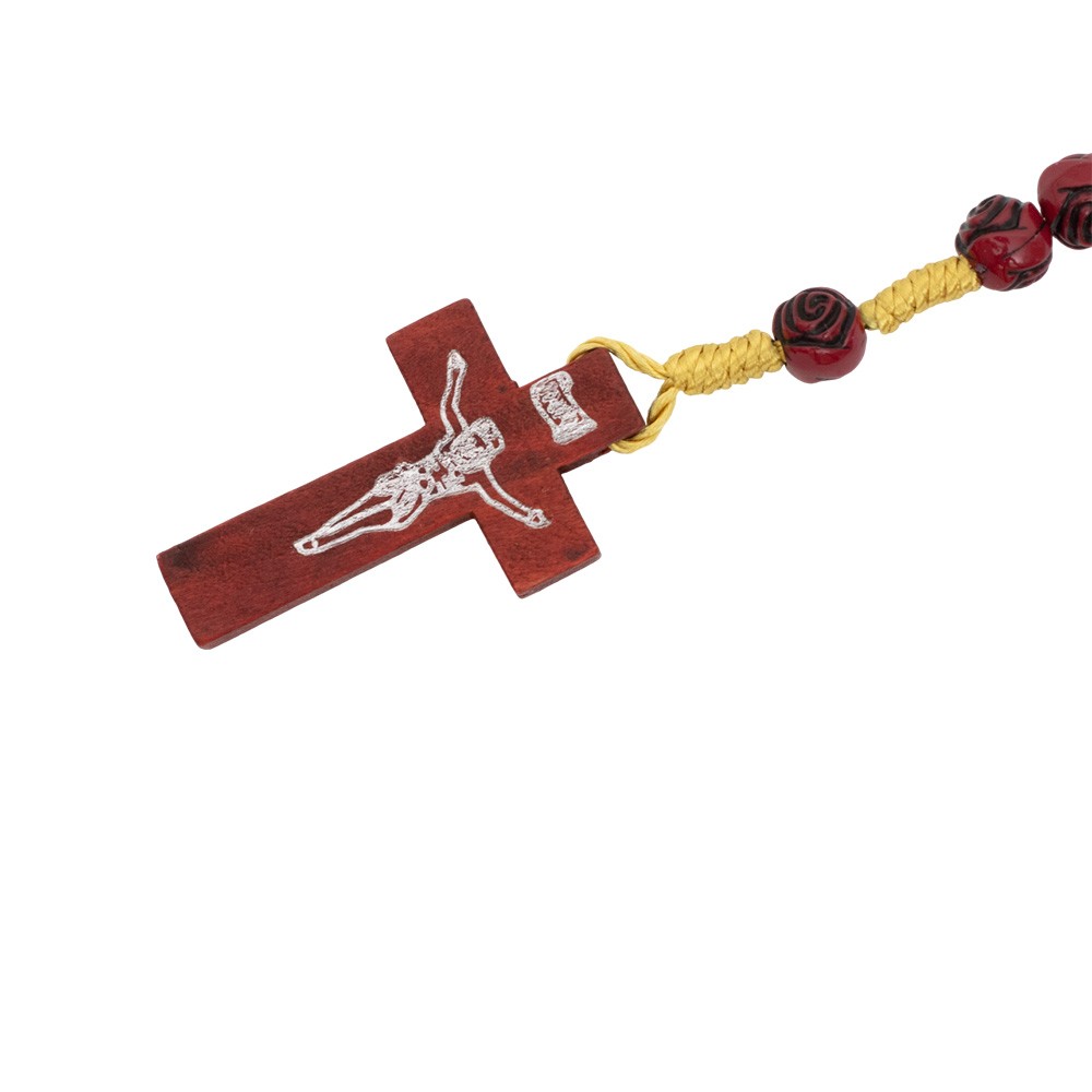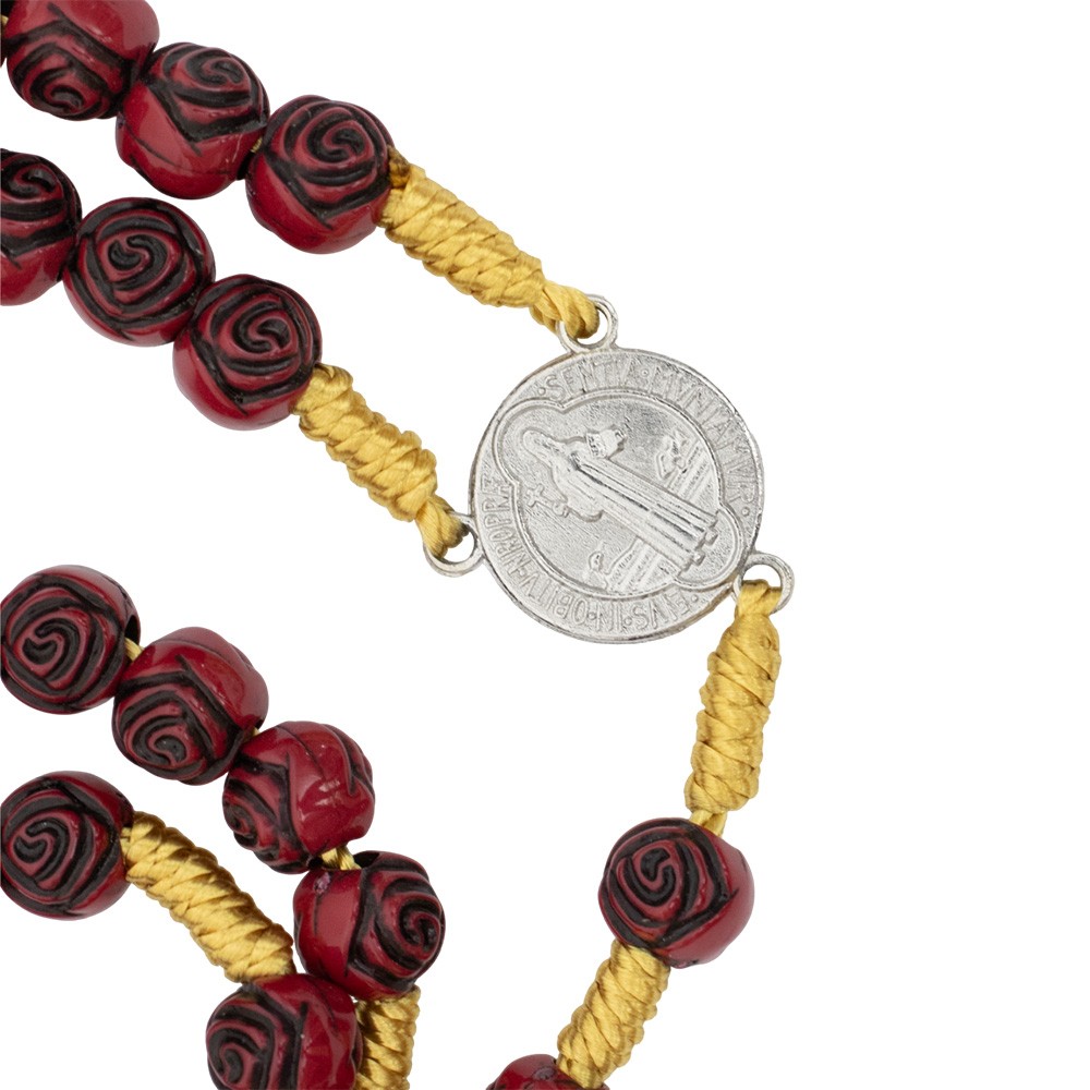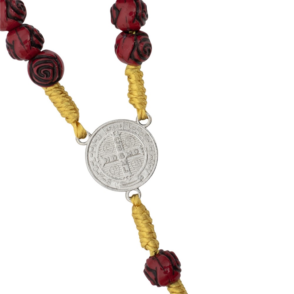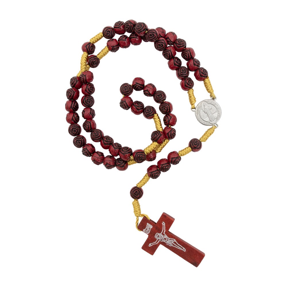 Rosario in legno e corda grani (rose) e crociera in metallo di San Benedetto, il tutto con legatura in corda chiara.