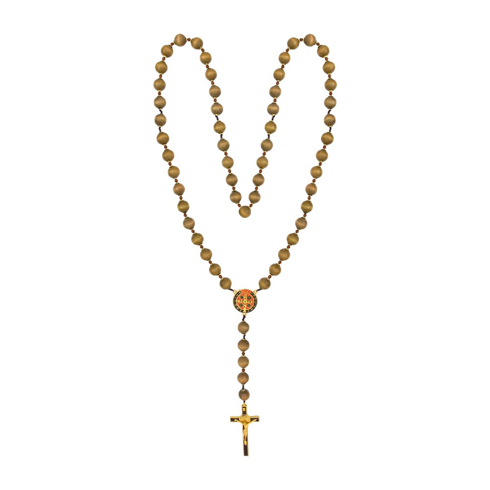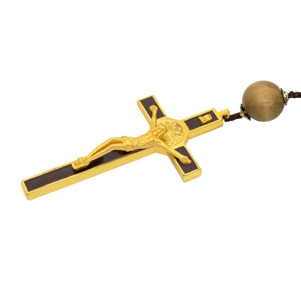 Realizzato con grani tondi in legno, croce e crociera in metallo oro e smaltato.