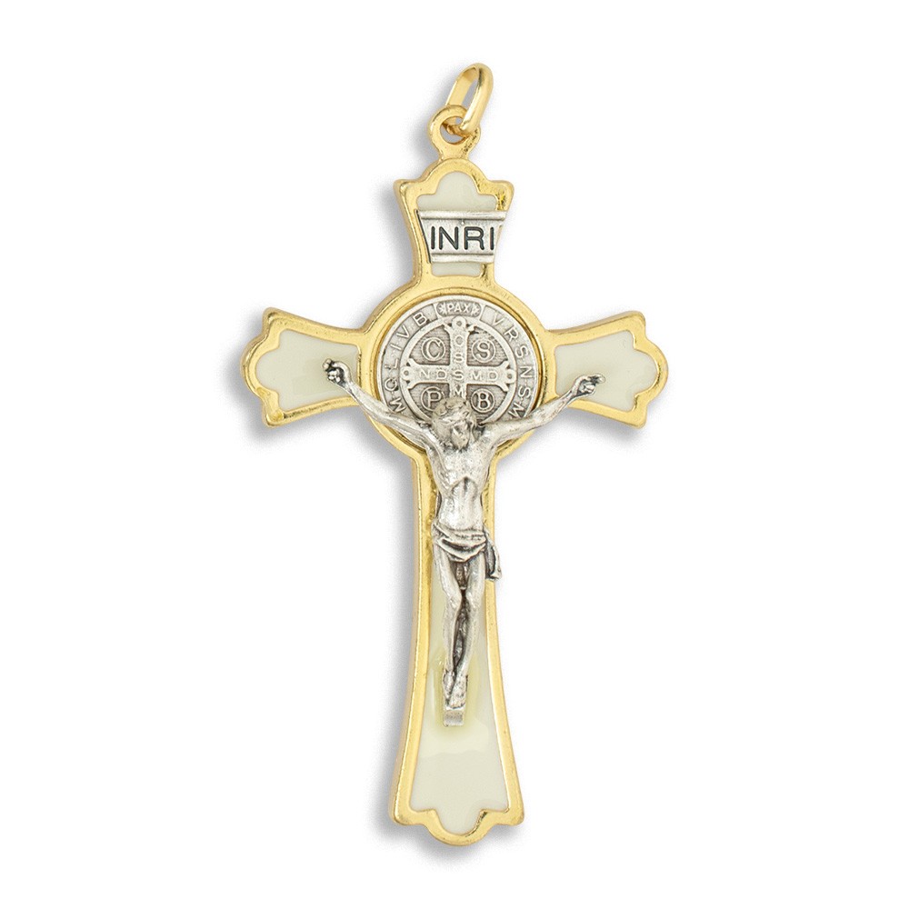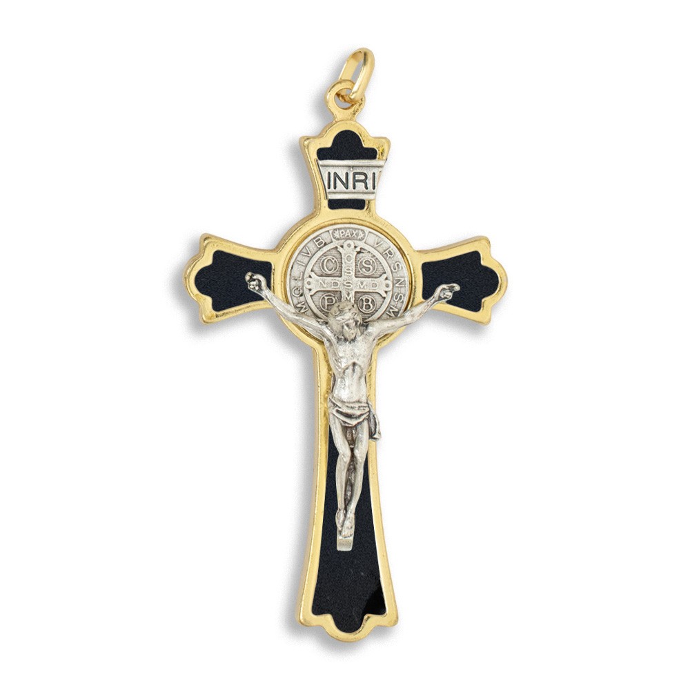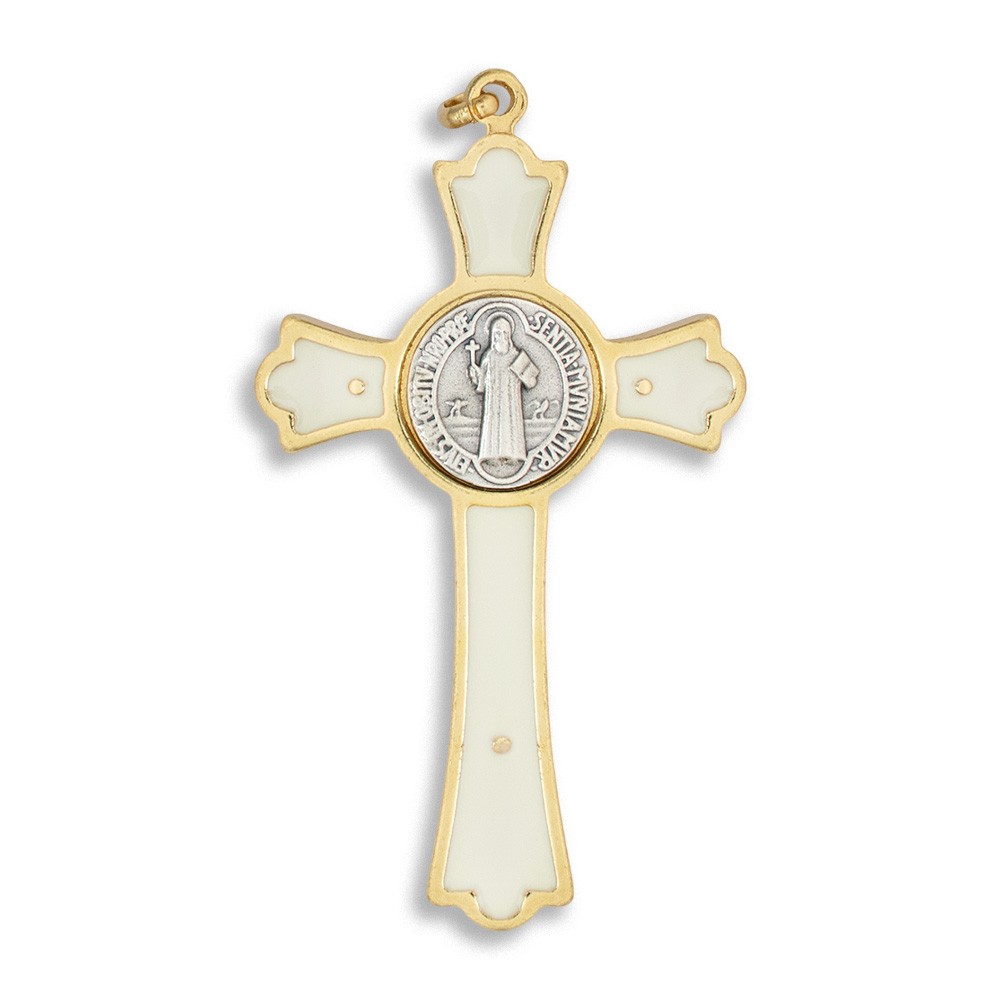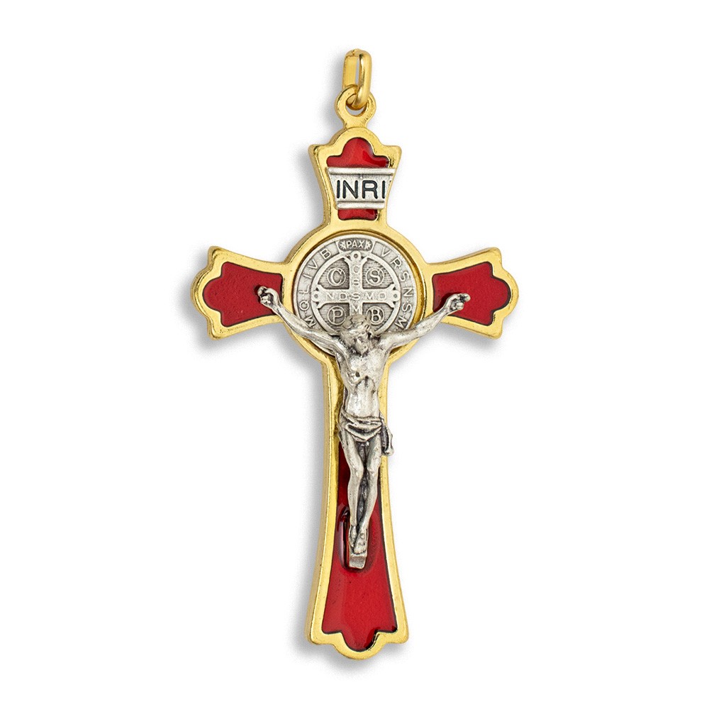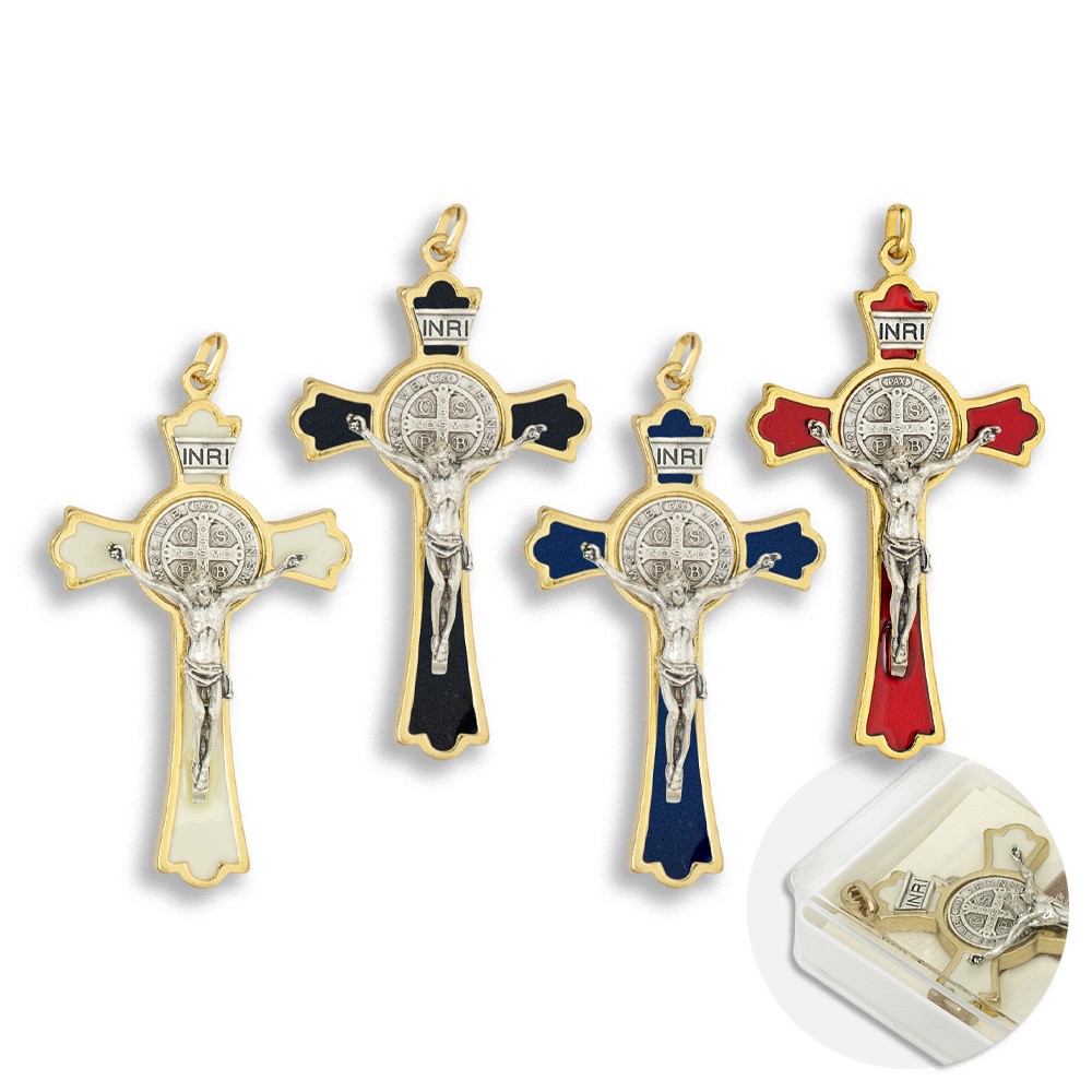 Croce di San Benedetto trilobata alta circa 7,4 cm realizzata in metallo dorata e smaltata in diverse colorazioni, completa di anellino apribile.