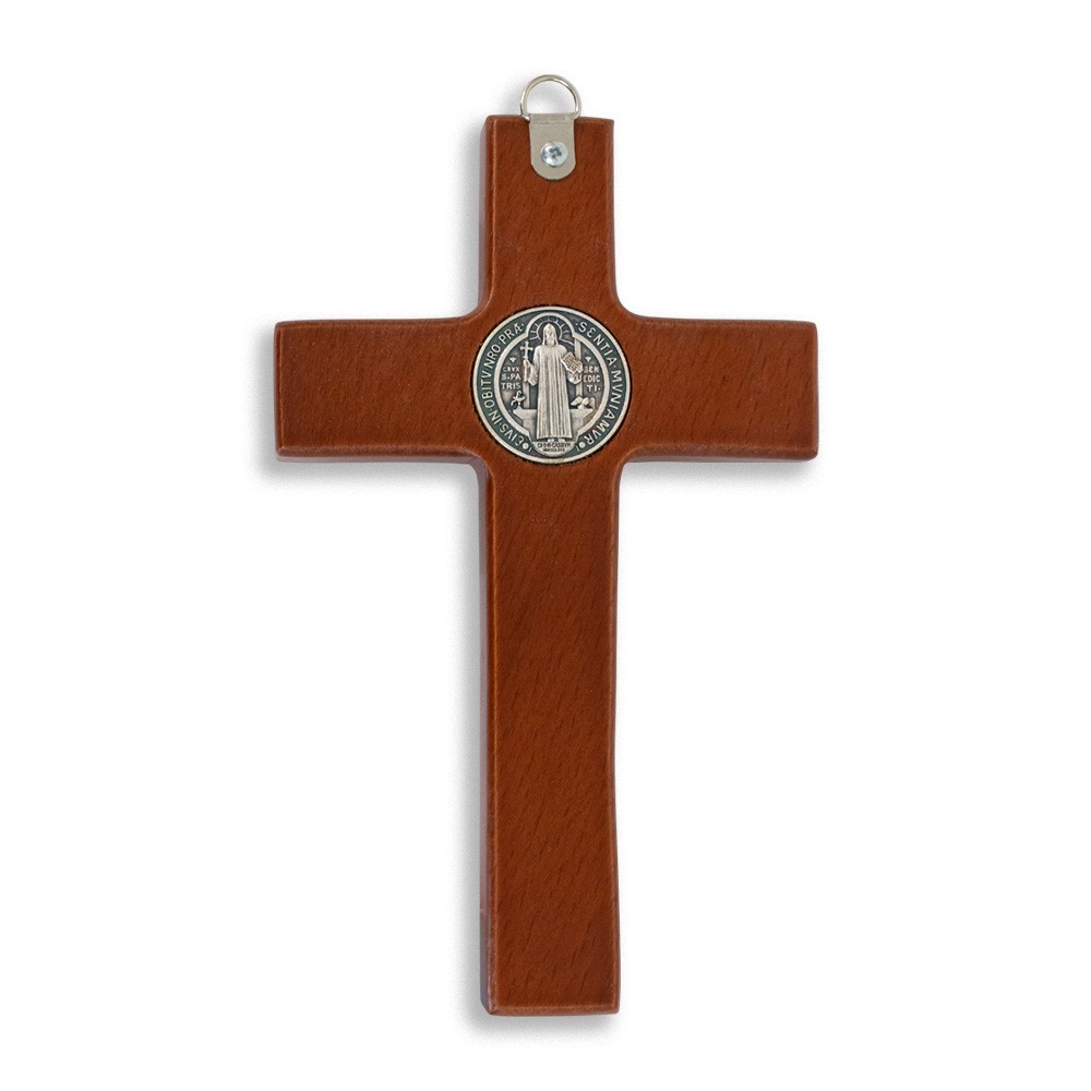 Crocifisso da parete di San Benedetto (18x11 cm) in legno di faggio con corpo di Cristo e medaglia in metallo argentato. Completo di scatola.