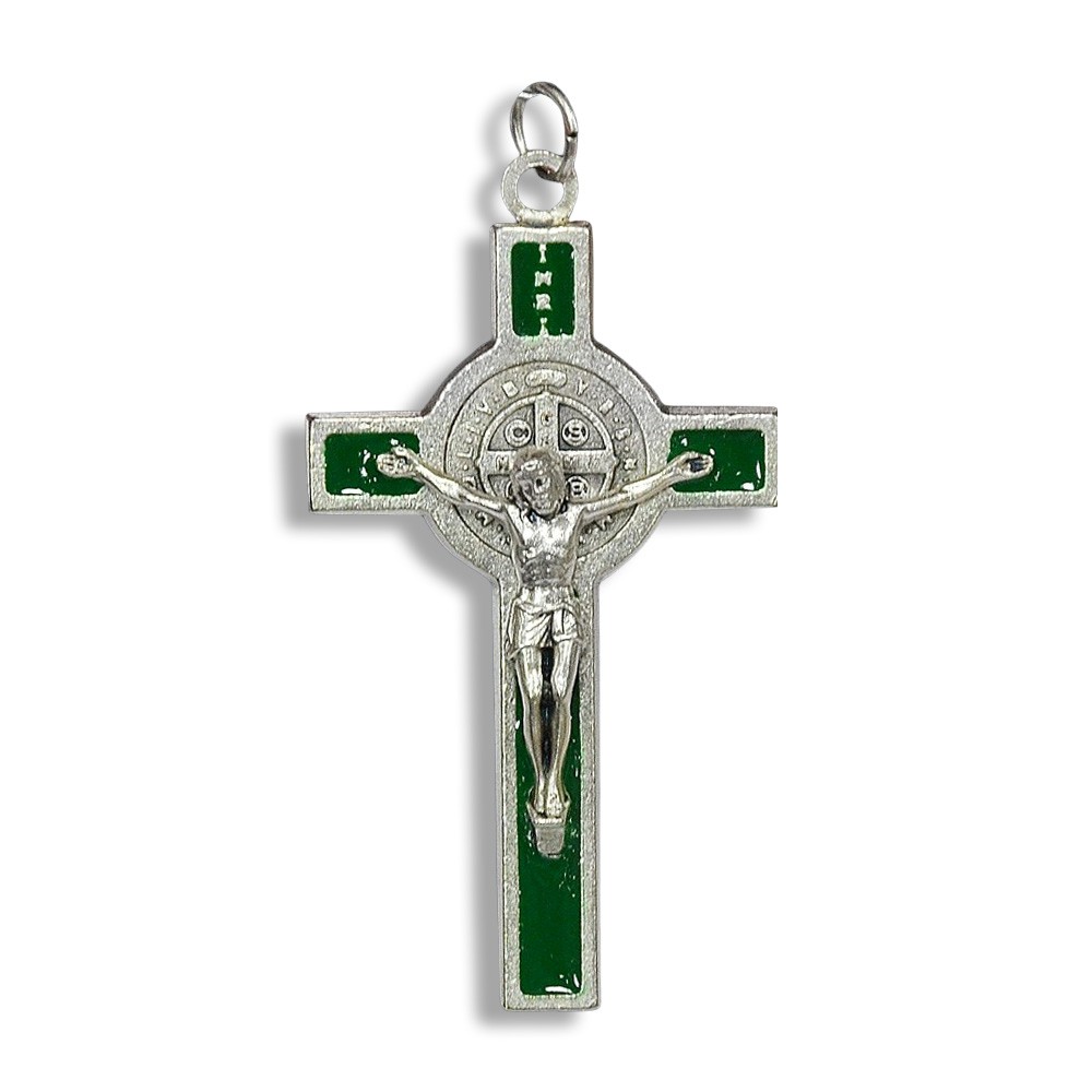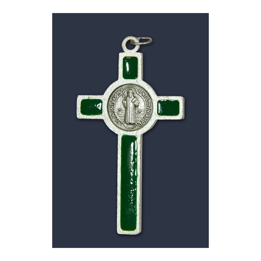 Croce San Benedetto argentata, con medaglia stampata e smalti. Altezza totale con anello 5,5 cm. Made in Italy.