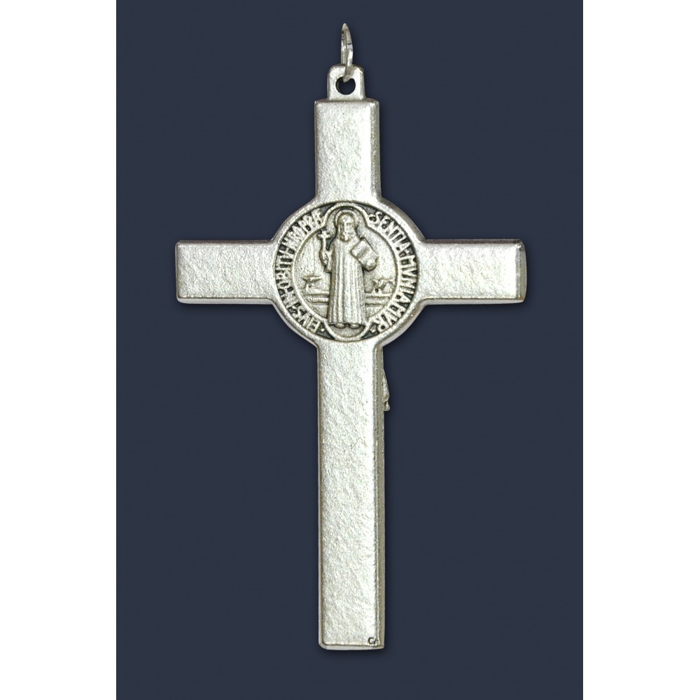 Croce San Benedetto argentata, con medaglia stampata e smalti. Altezza cm 8. Fornita con laccio marrone e scatola. Made in Italy.