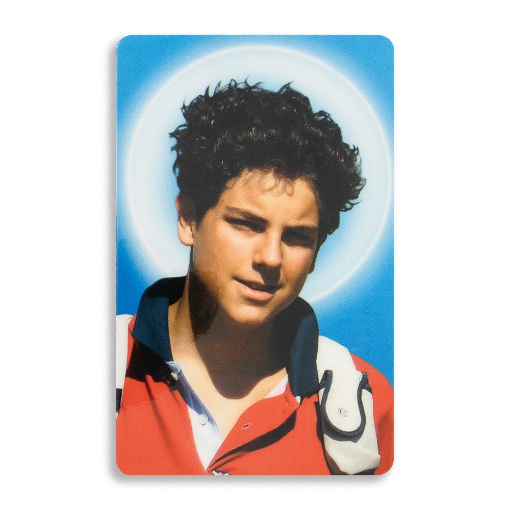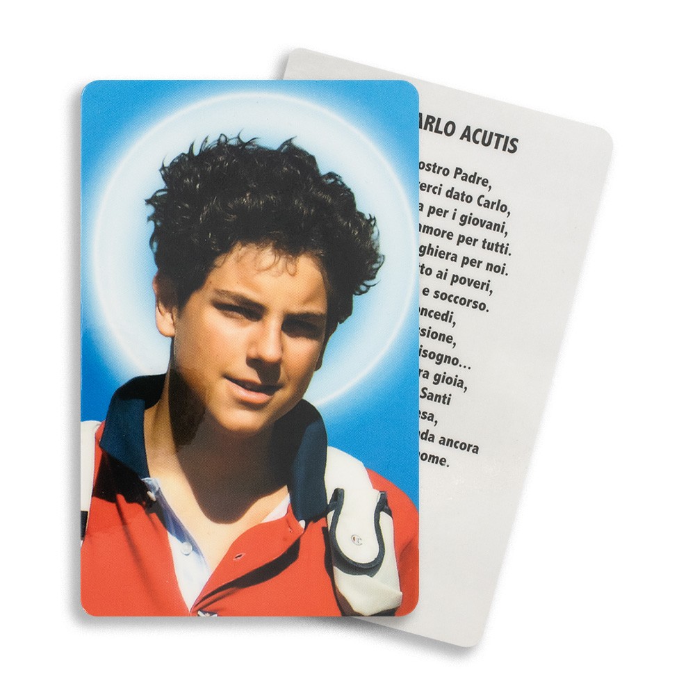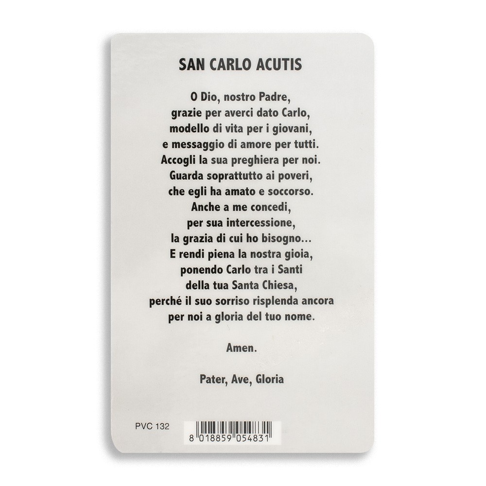 Card plastificata di San Carlo Acutis, misura 5,5x8,5 cm.