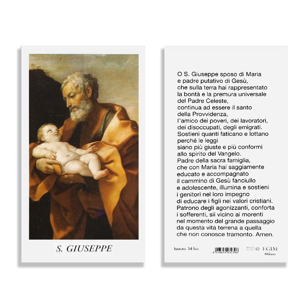 Il santino riporta sul fronte l'immagine di San Giuseppe, mentre sul retro vi è stampata la preghiera. Questa immaginetta è alta 10,5 cm ed è larga 6 cm.