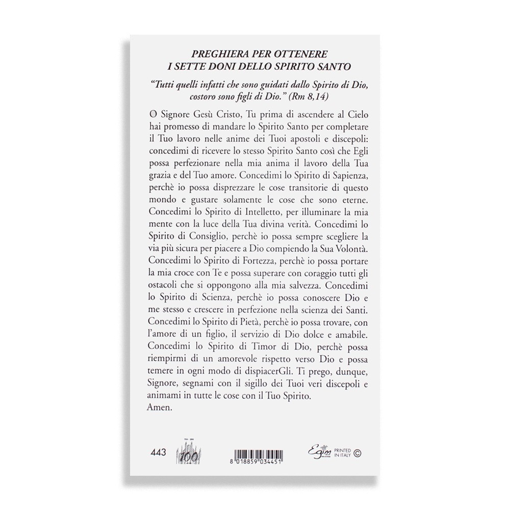 Ogni immaginetta riporta sul retro una preghiera per ottenere i sette doni dello SPIRITO SANTO.