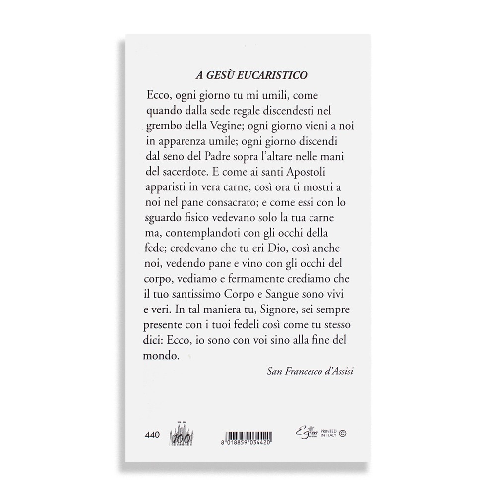Santini religiosi con preghiera e immagine dedicata a Gesù Eucaristico.