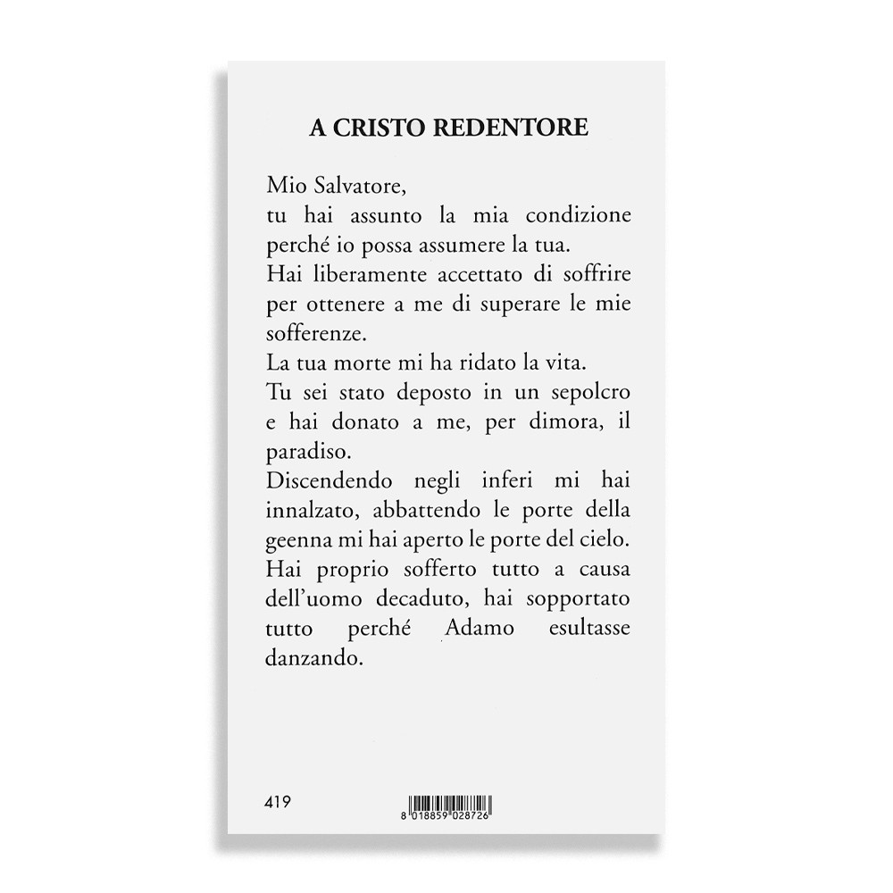 Immaginetta di Gesù Redentore completo di preghiera sul retro.