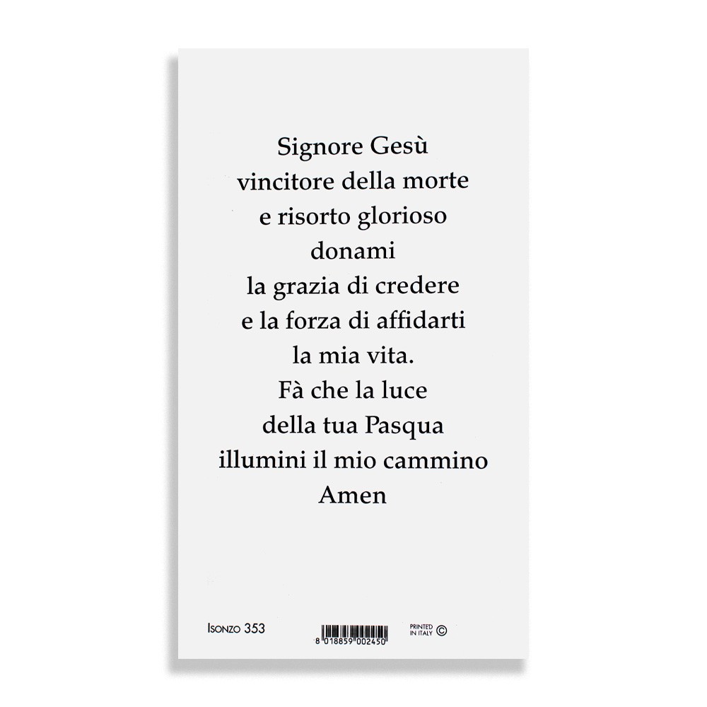 Santino sacro " La Resurrezione " sul fronte, mentre sul retro la preghiera stampata.