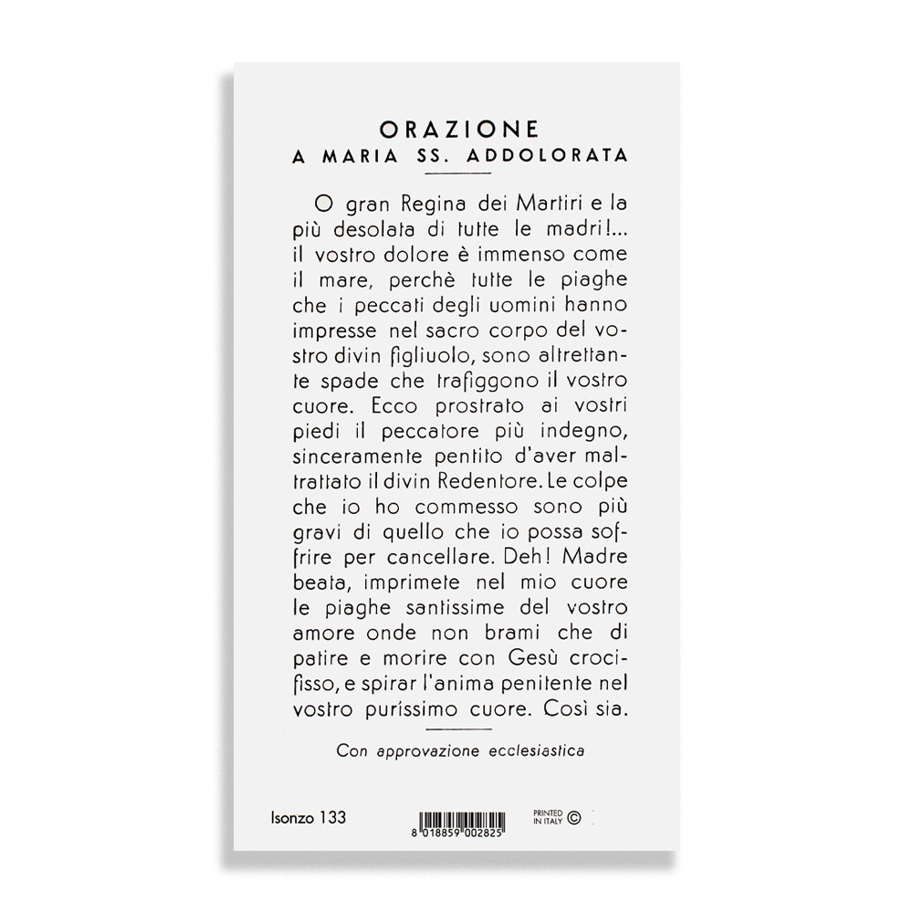 Su ogni immaginetta vi è stampata l'orazione a Maria Santissima Addolorata.