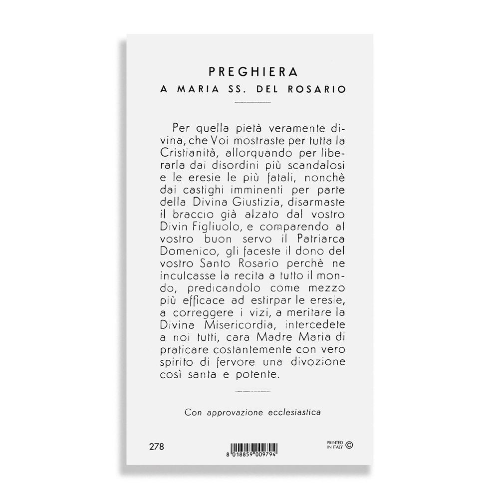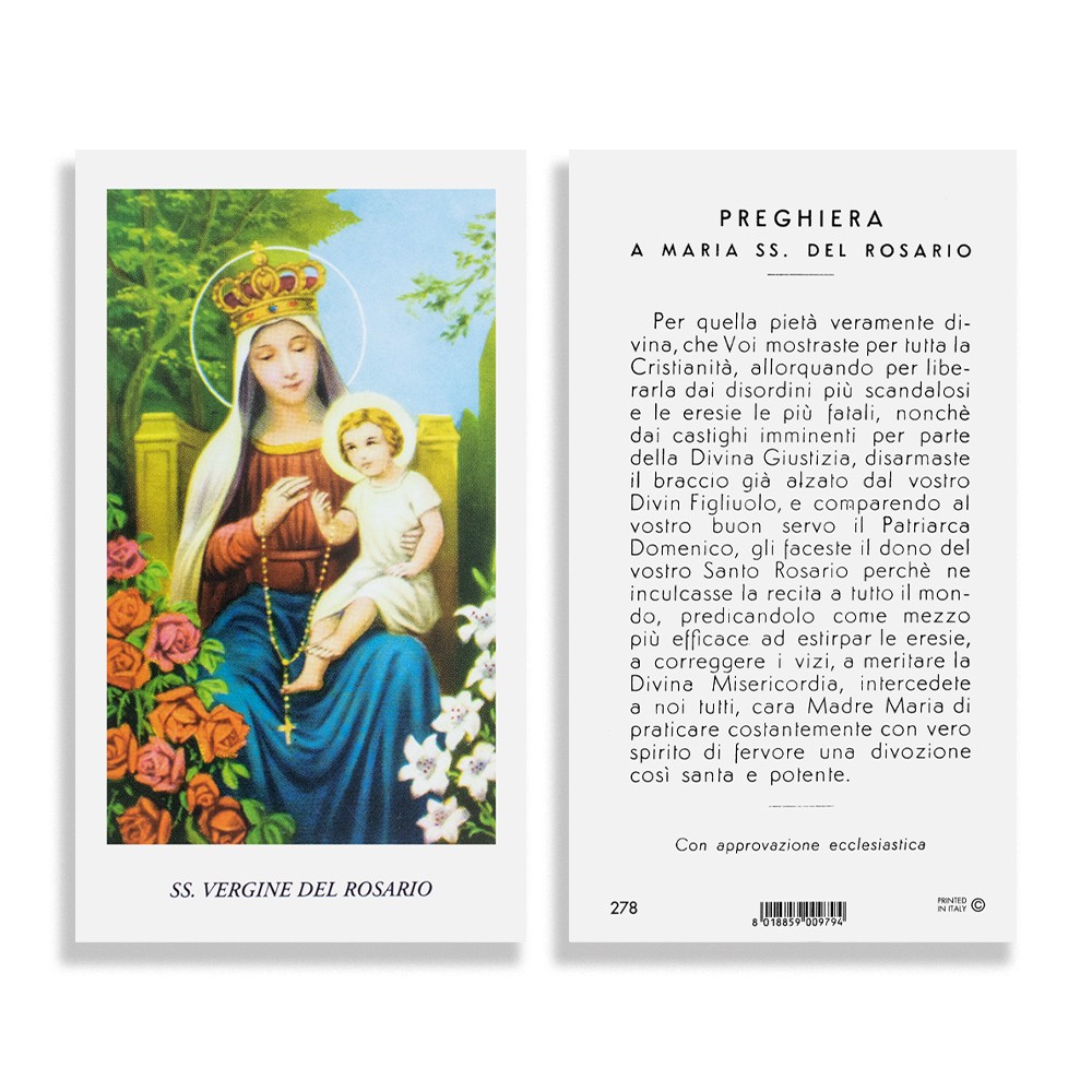 Santini religiosi con preghiera e immagine di Maria Santissima del Rosario.
