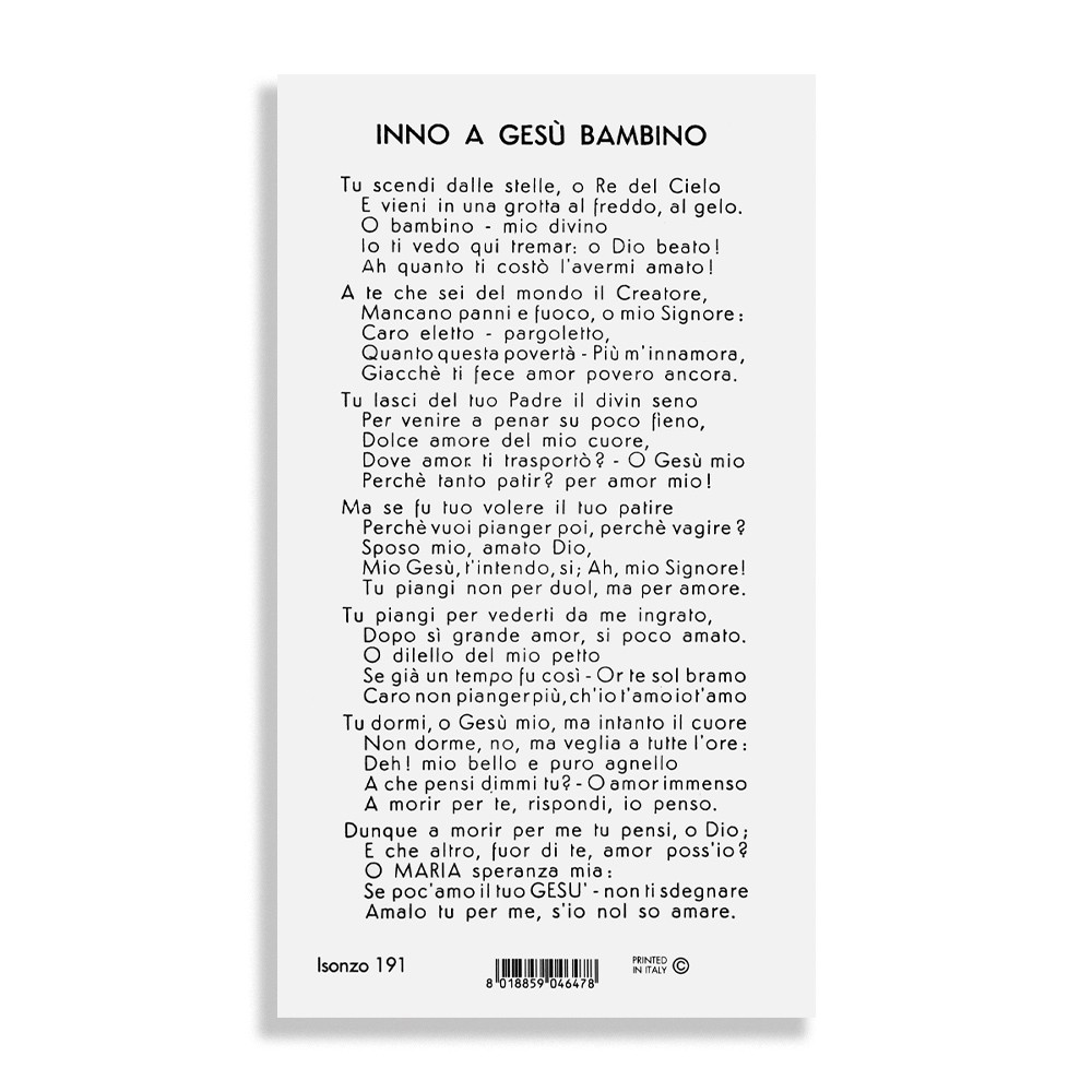 Santini religiosi con Inno a Gesù Bambino e immagine raffigurata dell'Adorazione dei Pastori.